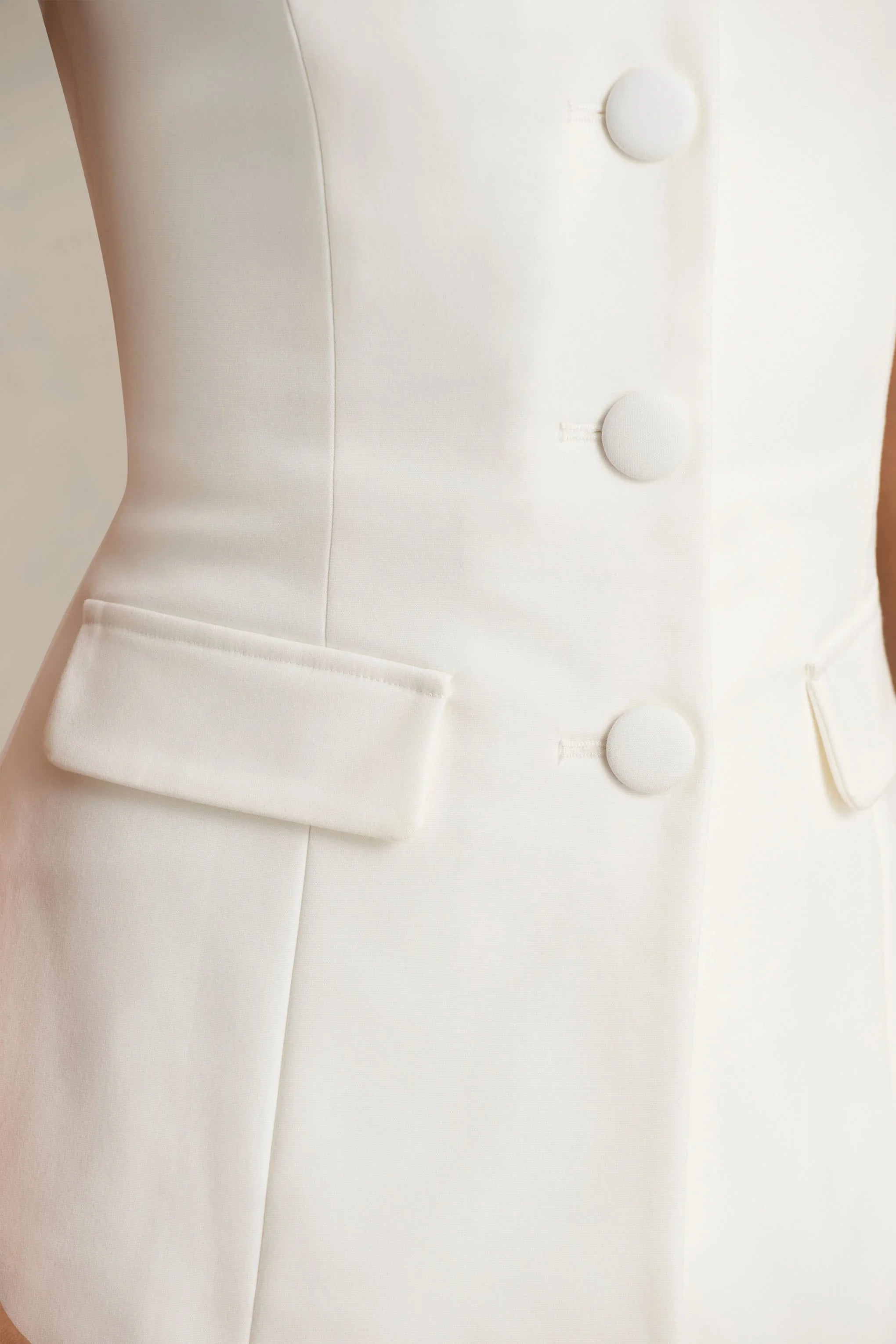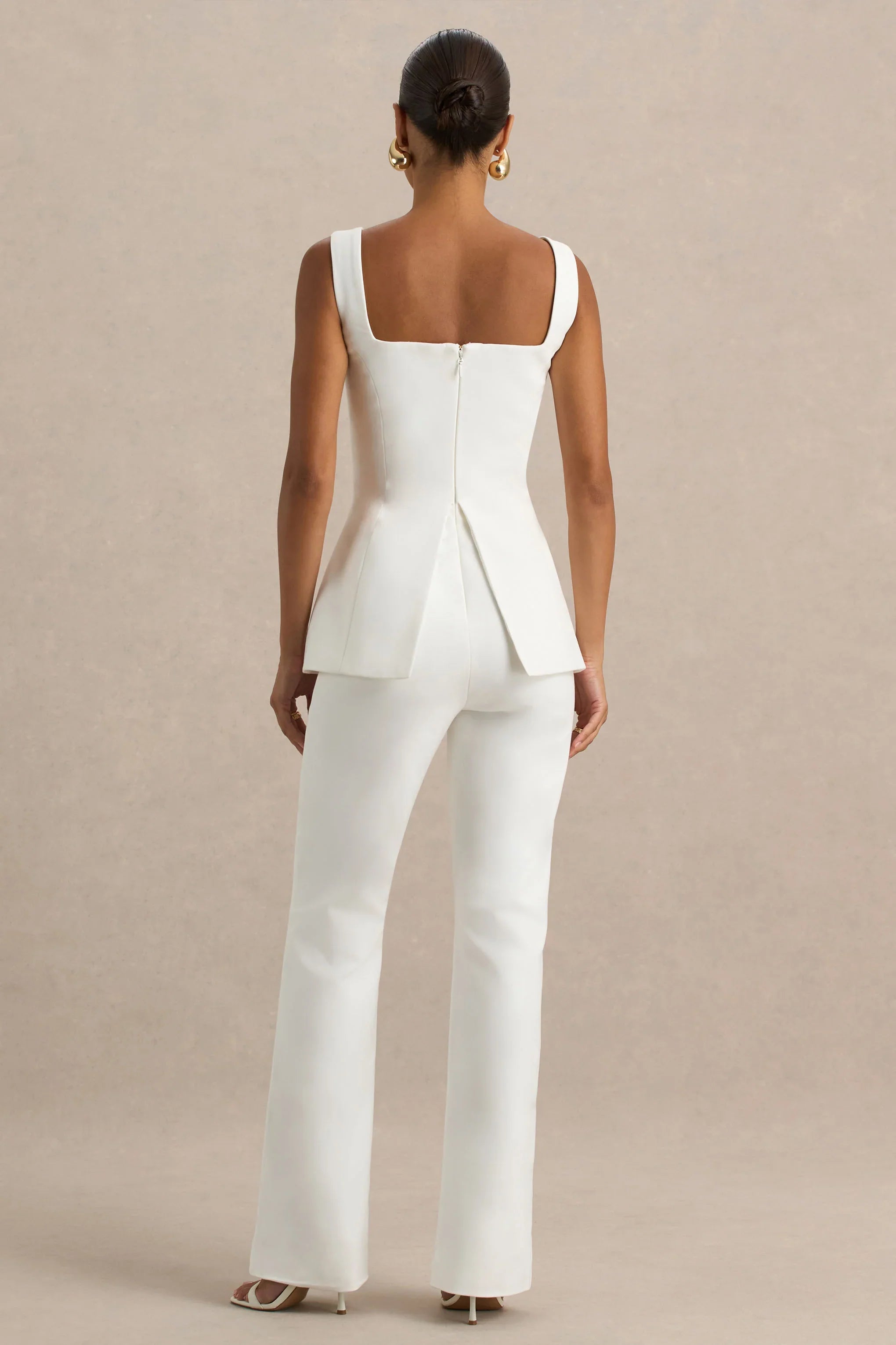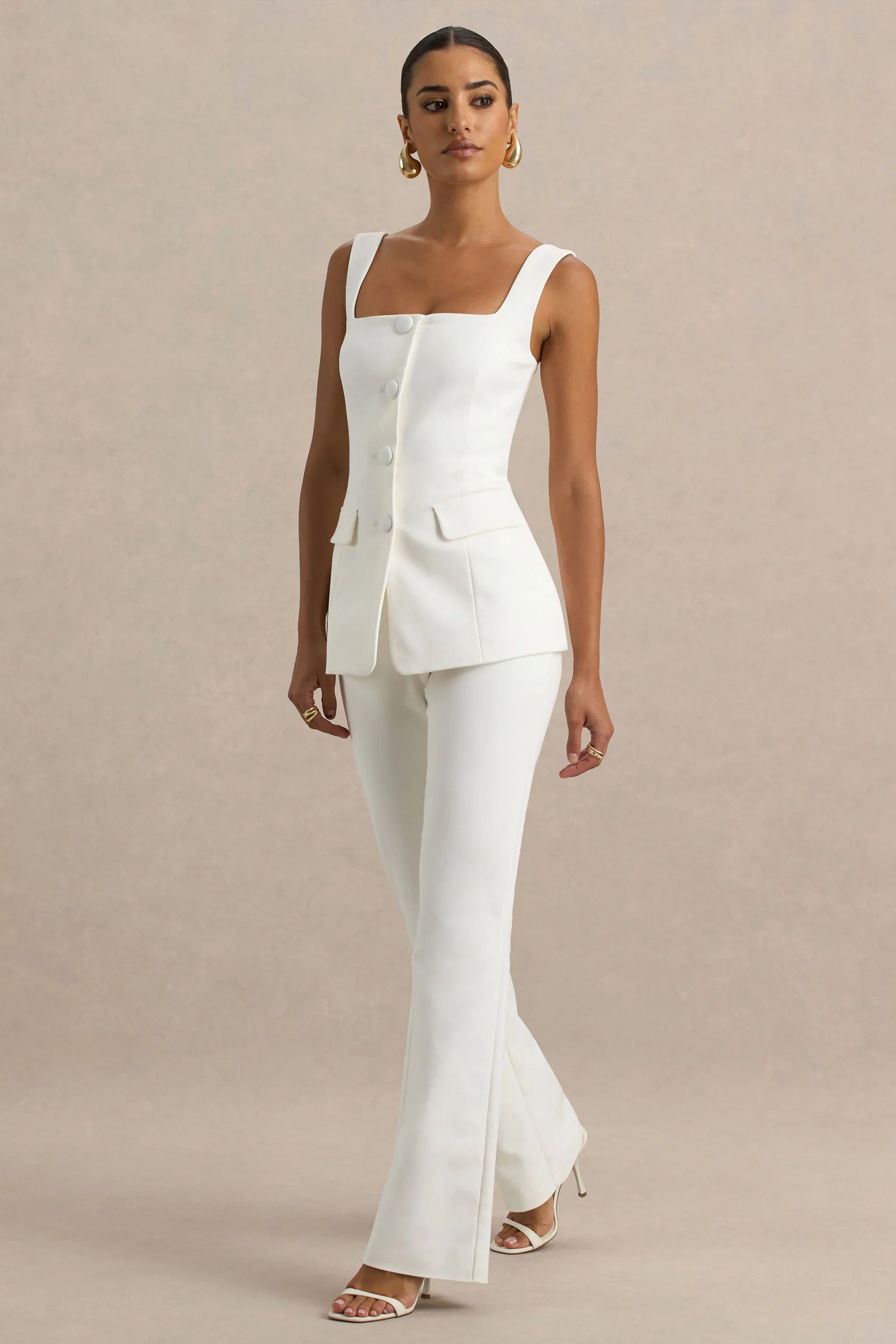 Embody a chic and understated vision in Aceline. Crafted in our premium cotton modal, in a delicate white hue, this jumpsuit is the epitome of elegance. Designed with a framing square neckline and a bodice adorned with details, including self covered buttons and faux pockets, this piece is made for making an entrance. The flared trousers ensure a figure flattering finish that'll have you looking sleek from every angle. Whether its a ladies lunch, a day at the races or a romantic date night, in Aceline you will exude confidence and style.