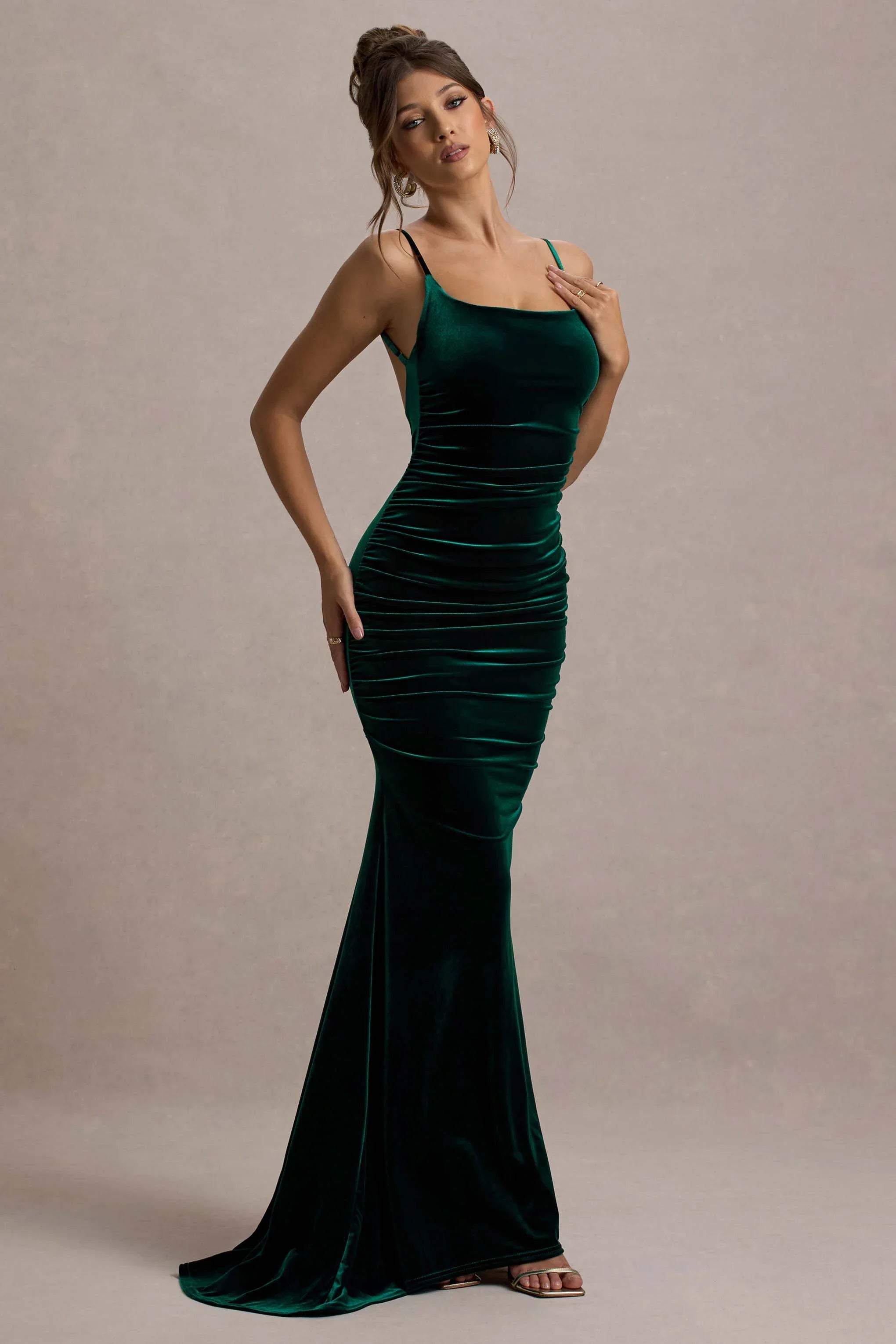 Who says the bride can solely bring the drama? Our latest maxi dress known as Adele is crafted from premium soft velvet in bottle green. A plunging back is supported from delicate straps which can be adjusted for the perfect fit whilst a fishtail skirt showcases a godet train from behind.