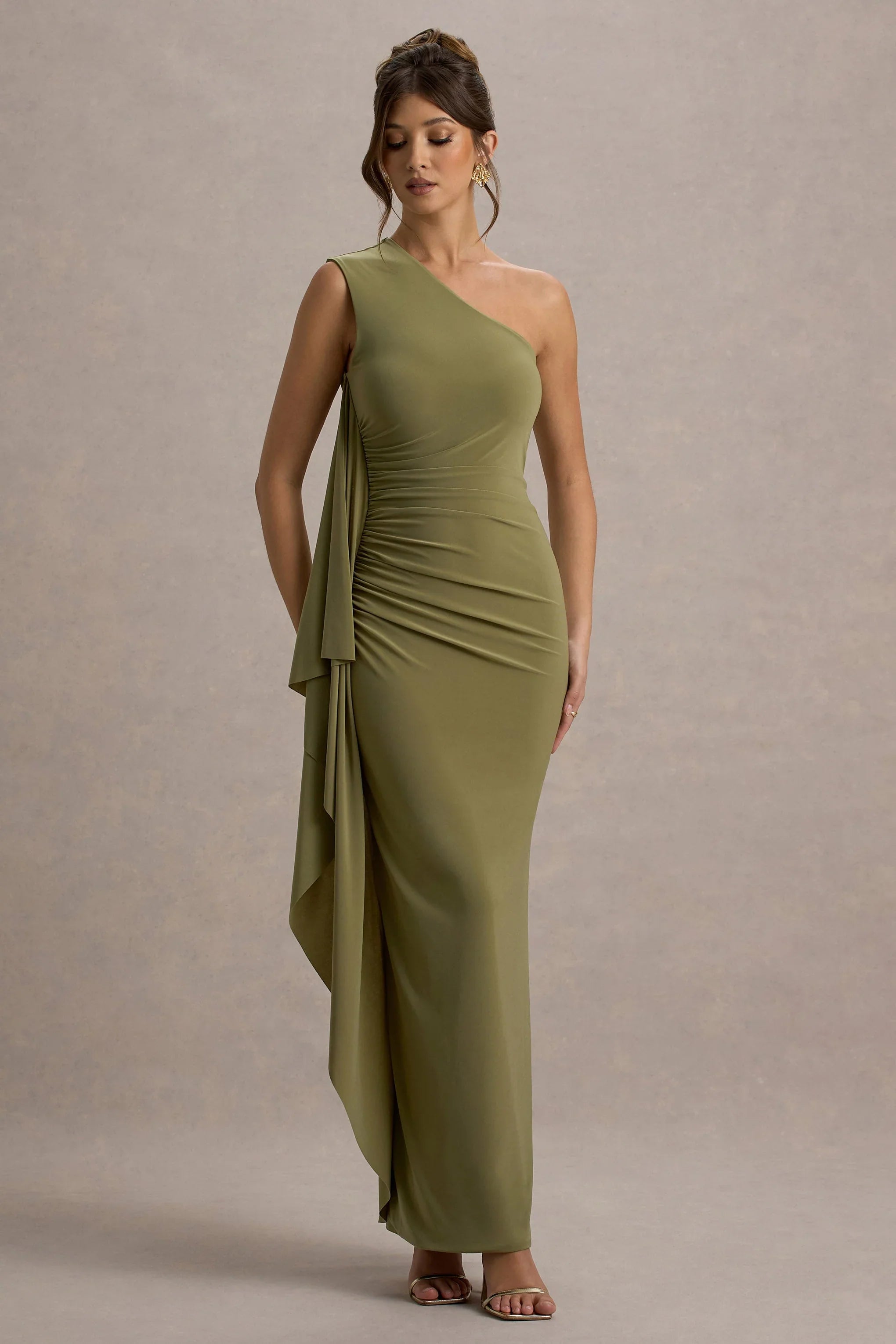 Defined by graceful lines and bold elegance, Adelina is a stunning option for your most special occasions. Crafted from premium jersey in an olive hue, this one-shoulder maxi dress exudes modern sophistication. The asymmetric neckline highlights the collarbone, while the expertly draped silhouette cascades beautifully to create effortless movement. Adelina is perfect for a look that radiates contemporary charm.