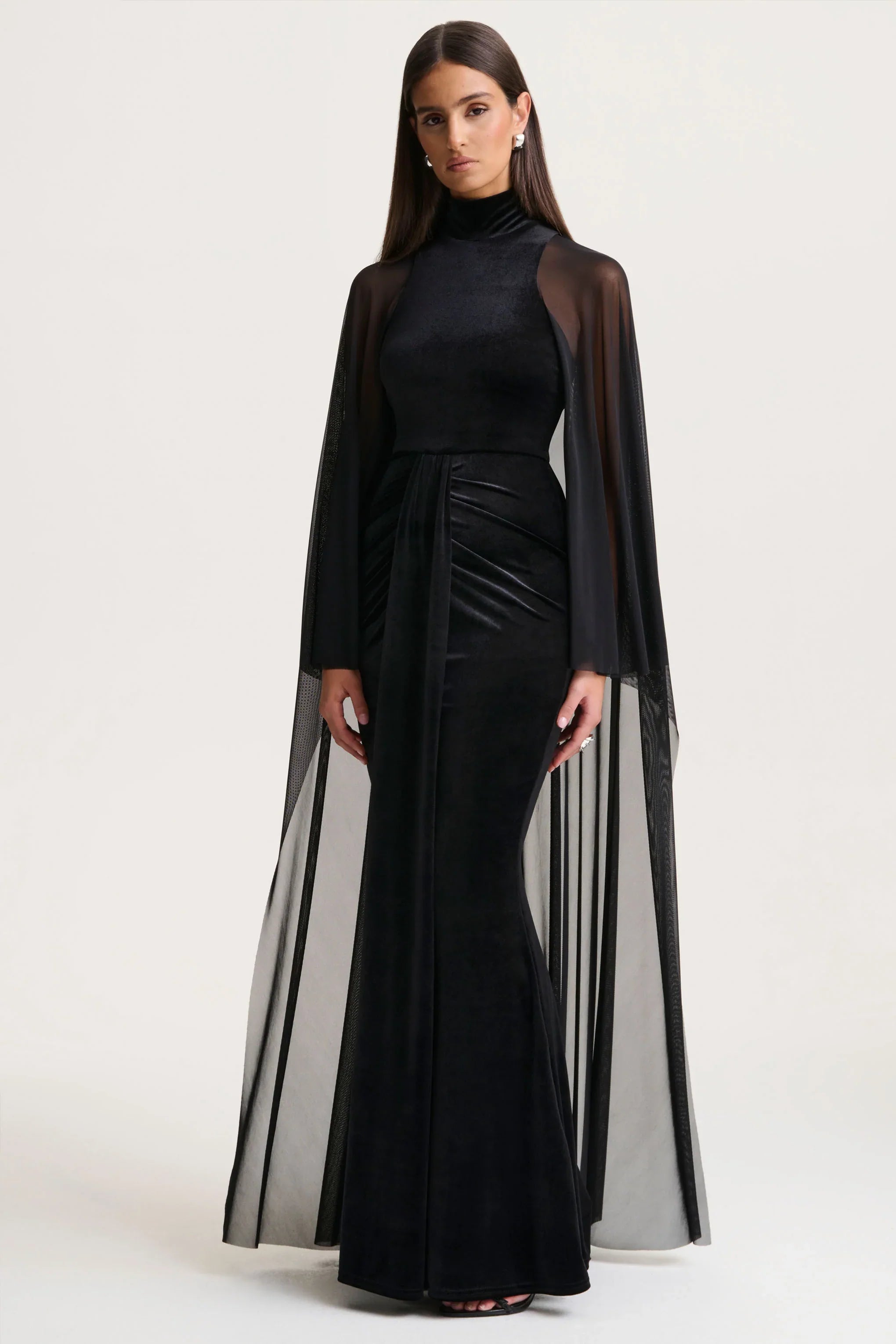 Adoring captures timeless elegance with a touch of dramatic charm. Crafted from our premium velvet in a deep black hue, this maxi-length design drapes beautifully over the silhouette. The high neckline frames the look with refined sophistication, while the cape detail adds movement and a statement finish. Soft gathered detailing enhances every curve, making Adoring a perfect choice for evenings that call for grace, confidence, and classic glamour.