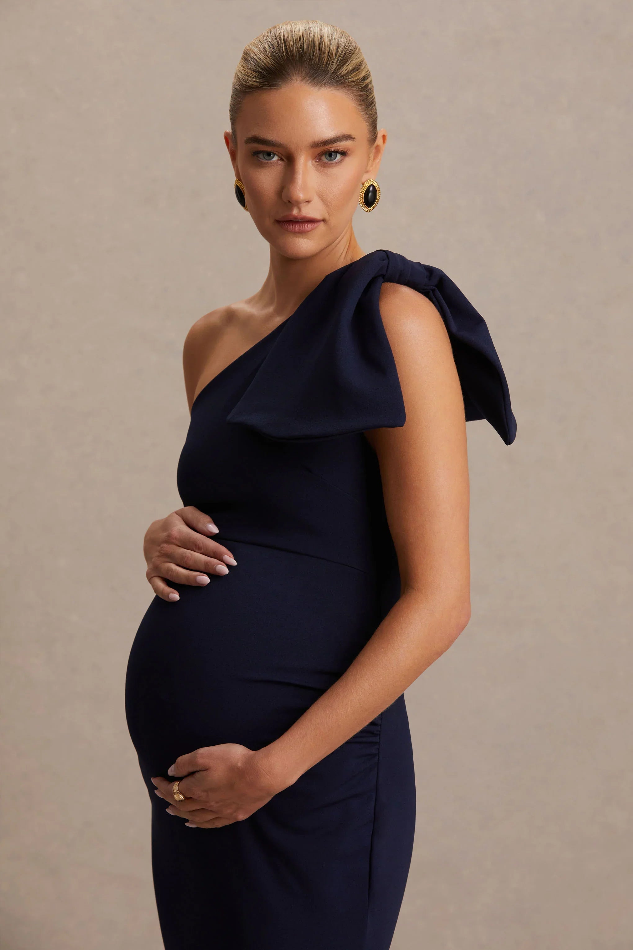 Prepare to capture the rooms attention in our stunning new midi, Adorn. Curated in our premium stretch jersey in a delicate shade of navy, this piece will gorgeously sculpt your curves. Featuring an elegant asymmetric neckline that is elevated with a statement vow detail, for a touch of drama and playful flare. Finished with delicate ruched detailing that flatters you're figure from all angles. Pair with a bold earring for your next special occasion.