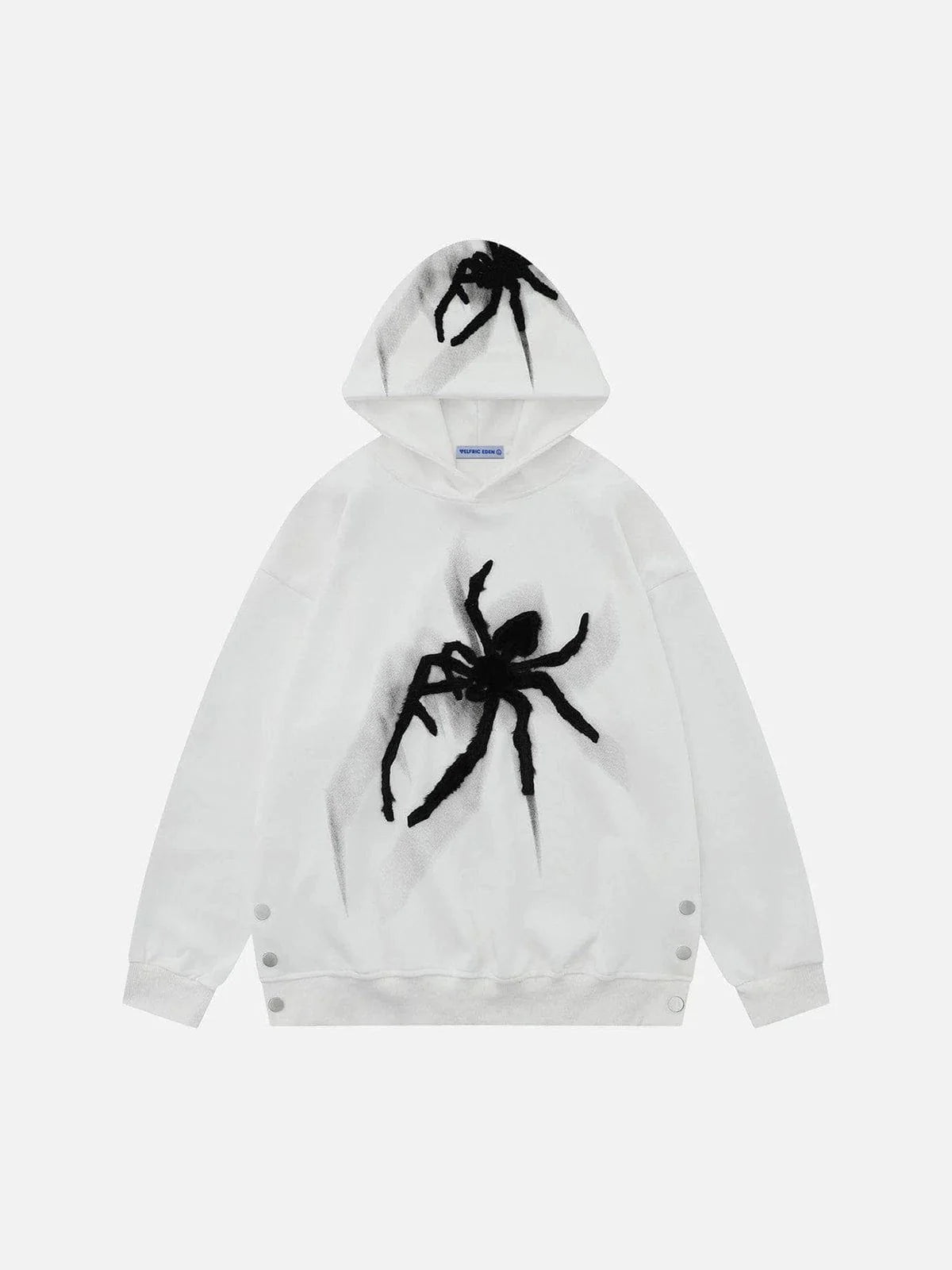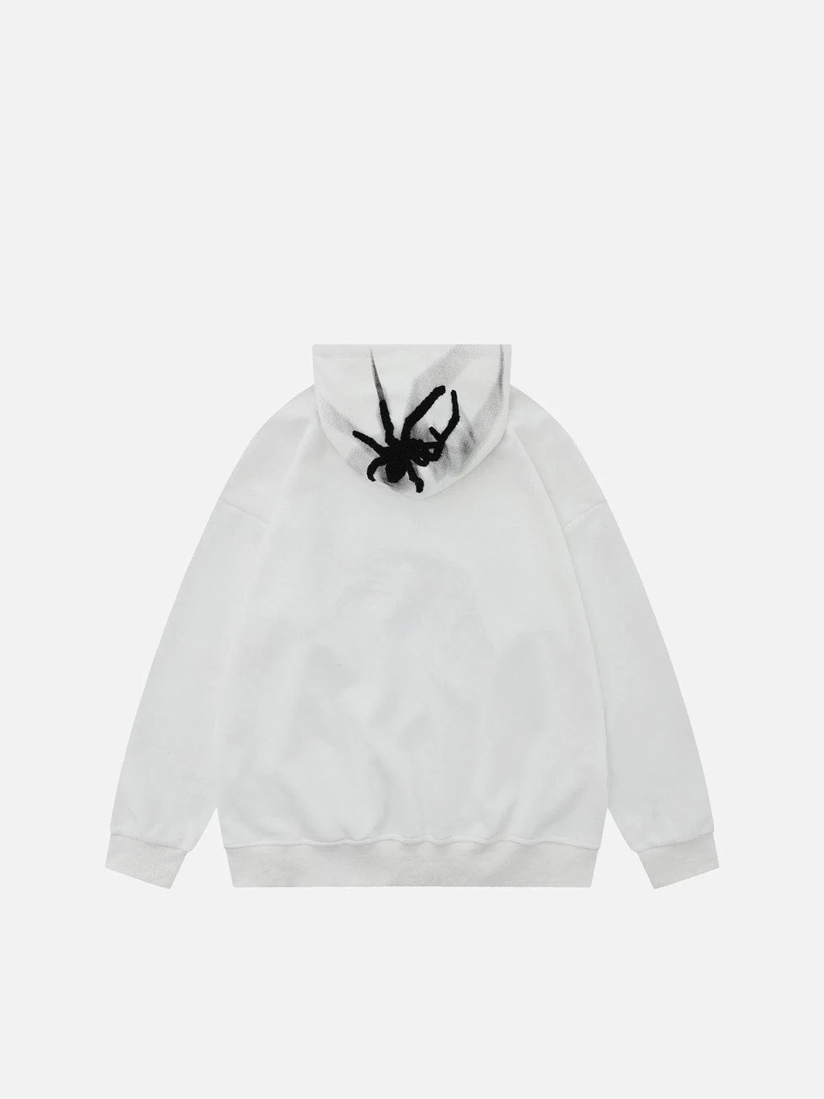 The front of the hoodie showcases one spider motif embroidered, and the hood features a spider, adding visual interest to the overall design. The contrast color allows the spider motifs to stand out and grab attention.