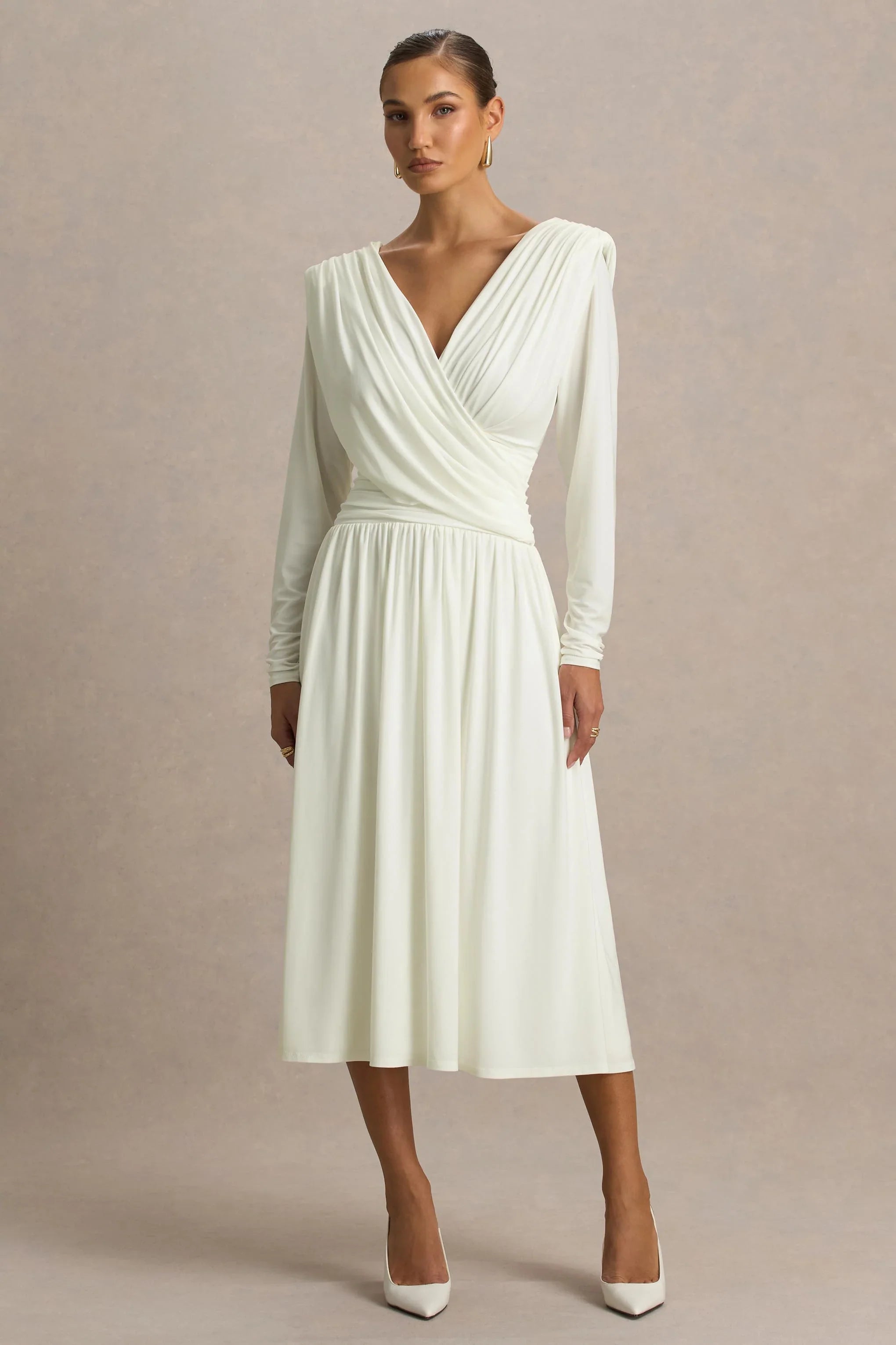 Turn heads with Alexis, as striking piece that embodies understated glamour. Cut from our premium cream stretch jersey, this figure-flattering midi silhouette flatters all the right places while offering a striking finish. A plunging neckline and wrapped bodice create a sculpted shape, perfectly balanced by loose-fitting long sleeves for an effortless touch of elegance. With draped detailing that enhances every curve, Alexis is the ultimate dress for elevated evenings and unforgettable moments.