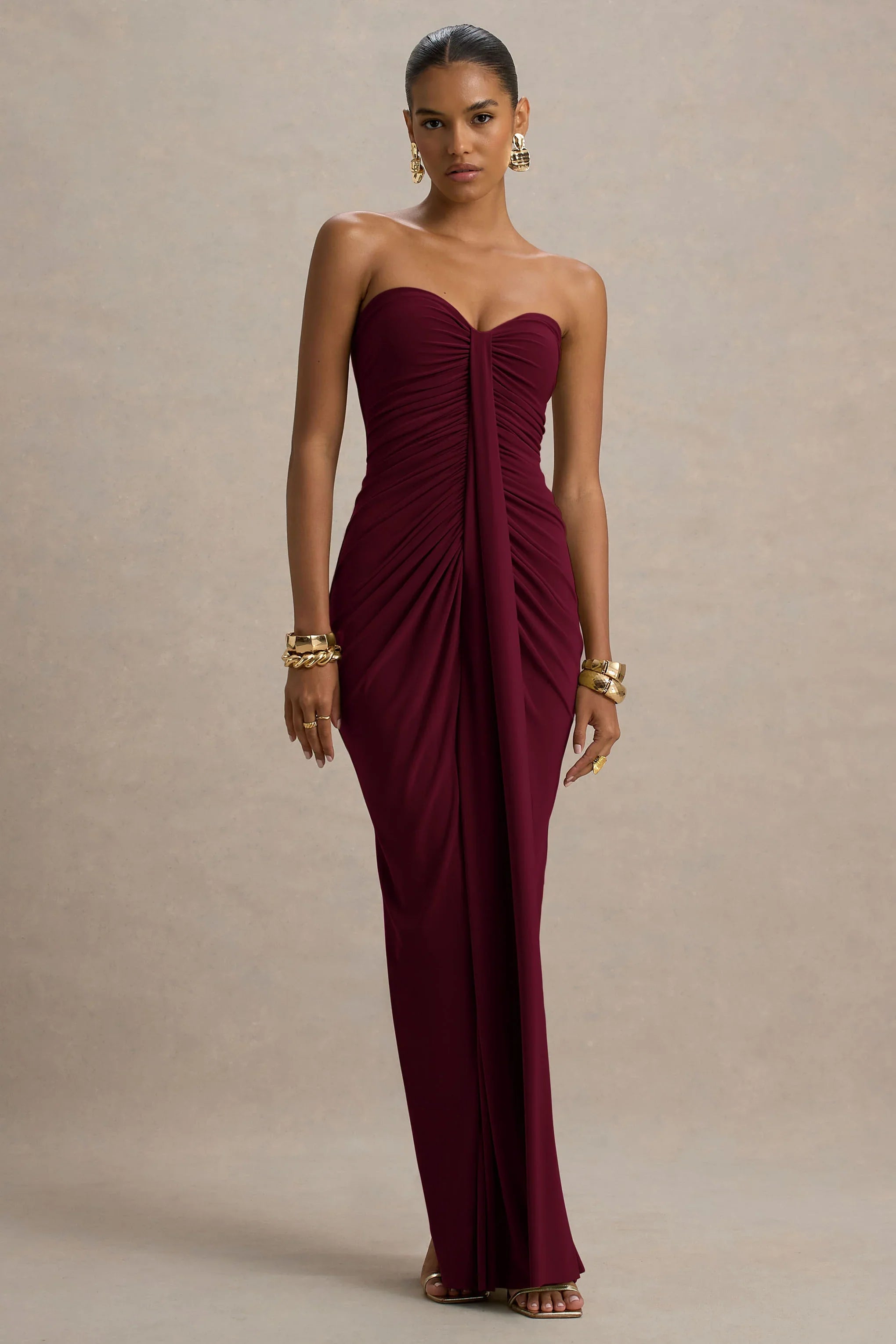 Make an effortlessly chic statement in our latest gown, Ali. Crafted in a rich burgundy hue of our premium stretch jersey, this maxi dress elegantly skims over your curves. The sweetheart neckline adds a touch of soft romance, that is complimented by the delicate ruched detailing. Completed with a stunning front sash to add a bit of drama to this timeless silhouette, making this piece perfect for stand-out moments. Style with gold accessories for your next evening affair.