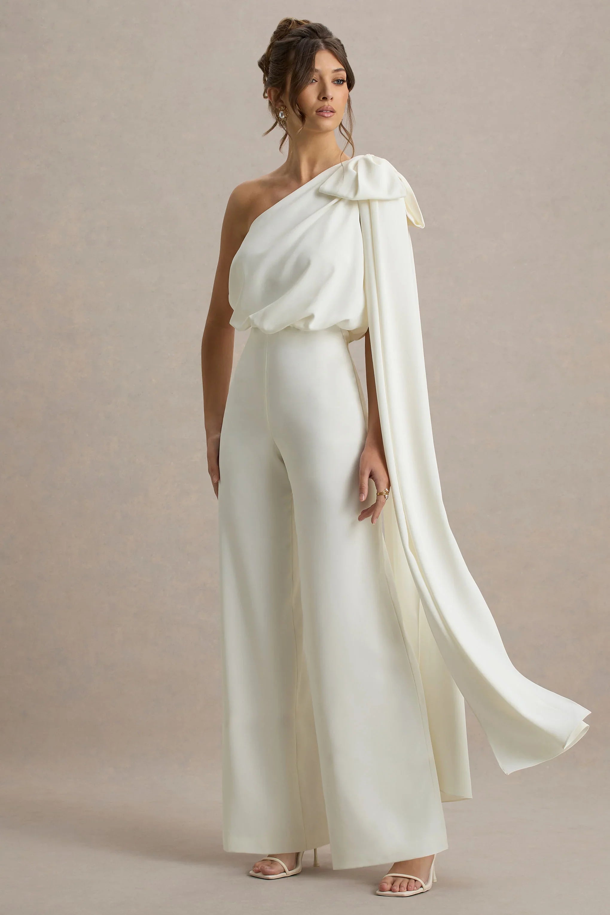 Adorned with head turning details, in Alice you will make an entrance at any occasion. Curated in a timeless cream shade of our premium stretch crepe, this jumpsuit flatters your figure from all angles. Featuring a modern asymmetric neckline that is elevated with a statement bow detail, which beautifully cascades into a striking sash. This piece is a seamless blend of timeless femininity and playful elegance. Style with a clutch bag and sleek heels for a poised and chic look.