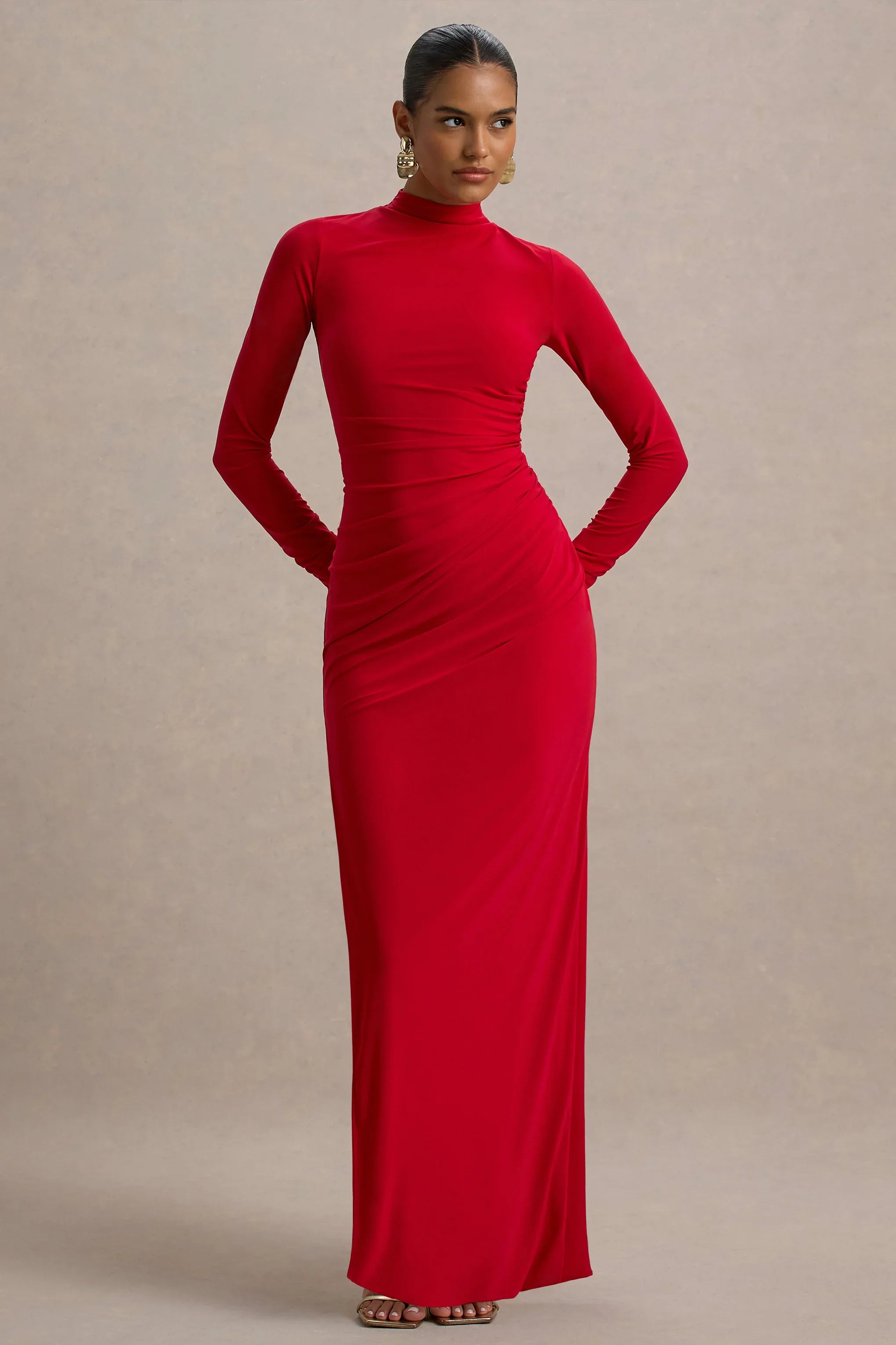 For the ultimate snatched look, Alluring is the piece for you. Designed in a bold red shade of our premium stretch jersey this maxi dress hugs your curves gorgeously, ensuring you look sleek and flattered from all angles. Finished with a high neck and delicate ruched detailing, this is a must have, elevated yet classic piece that every girl needs in there wadrobe. Style with statement earrings and a glamorous up-do, for a look that'll turn heads at any occasion.