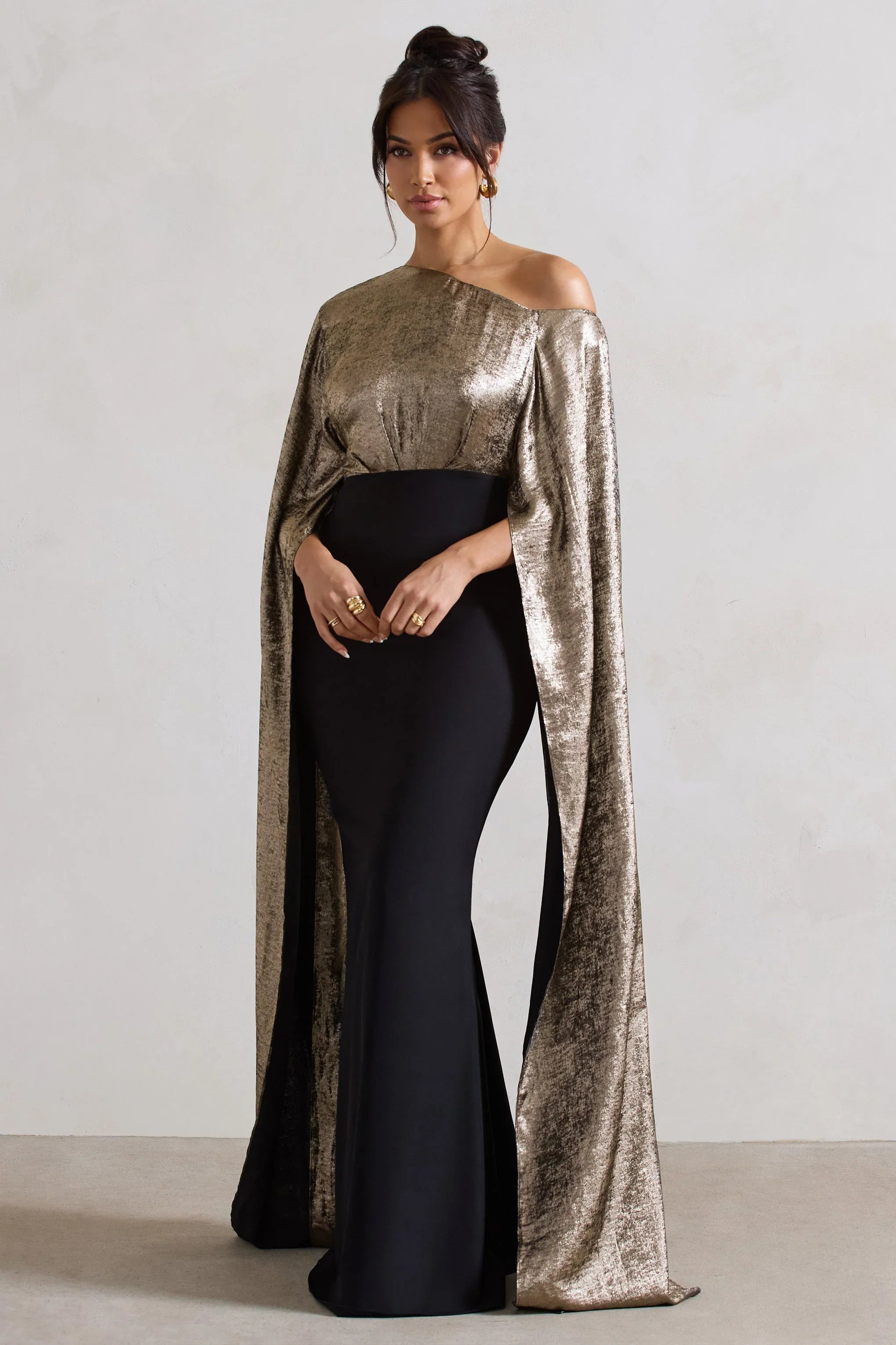 Alluring in asymmetry, Alura will have you the centre of attention at any event. Cut in a sculpting premium crepe, the main feature of this dress is its shimmering gold bodice that flows into elegant cape sleeves. Style this contrasting piece with a sleek bun and strappy gold stilettos for a statement ensemble.