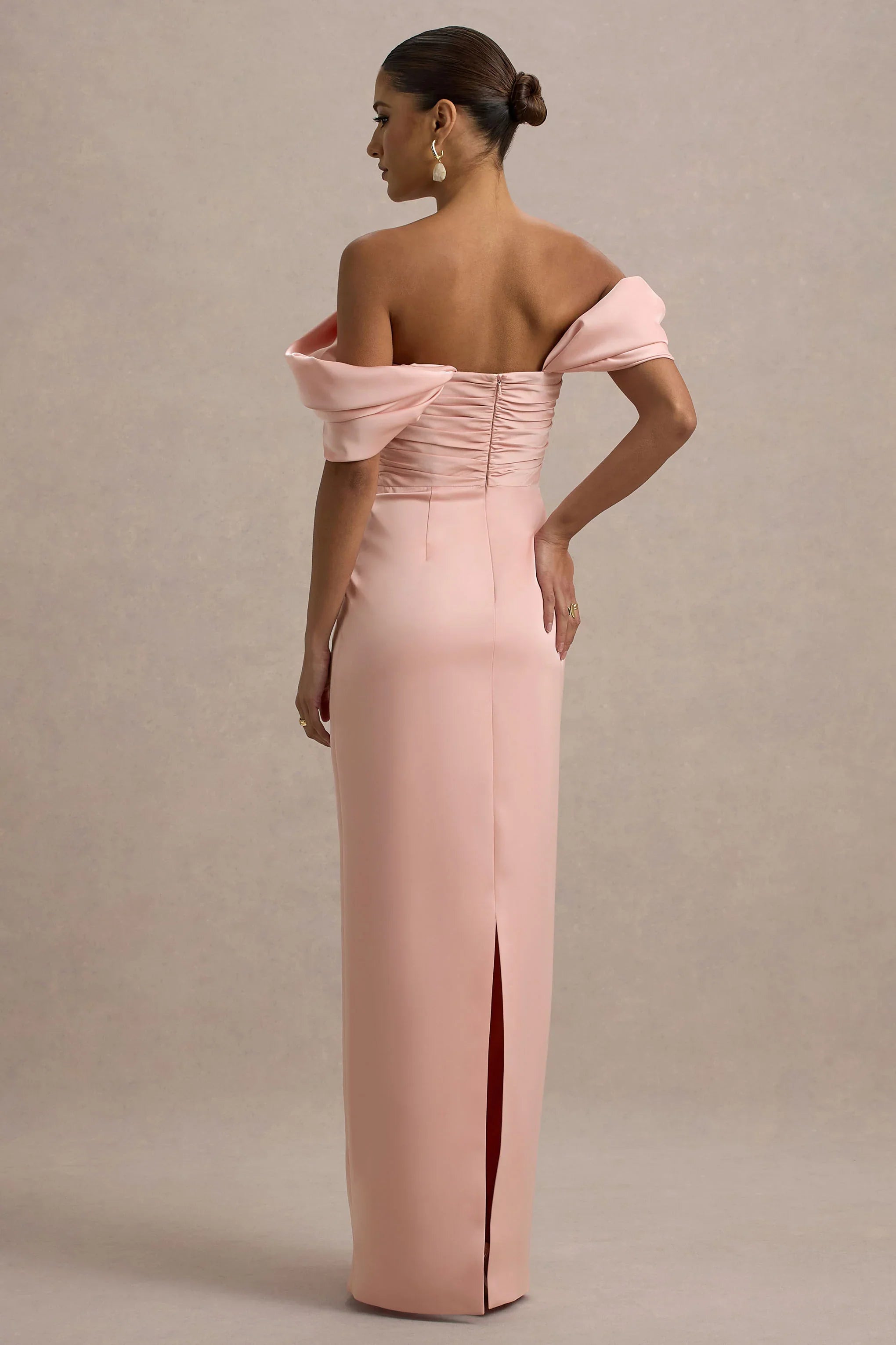 Dripping in elegance, our latest maxi Annita has arrived. Cut in our premium satin for a luxe finish, in a light pink hue. The bardot neckline is complimented by soft draping sleeves, highlighting your decolletage for a romantic and feminine feel. Perfect for weddings or any black tie events this season, paired with a sleek updo and gold jewellery.