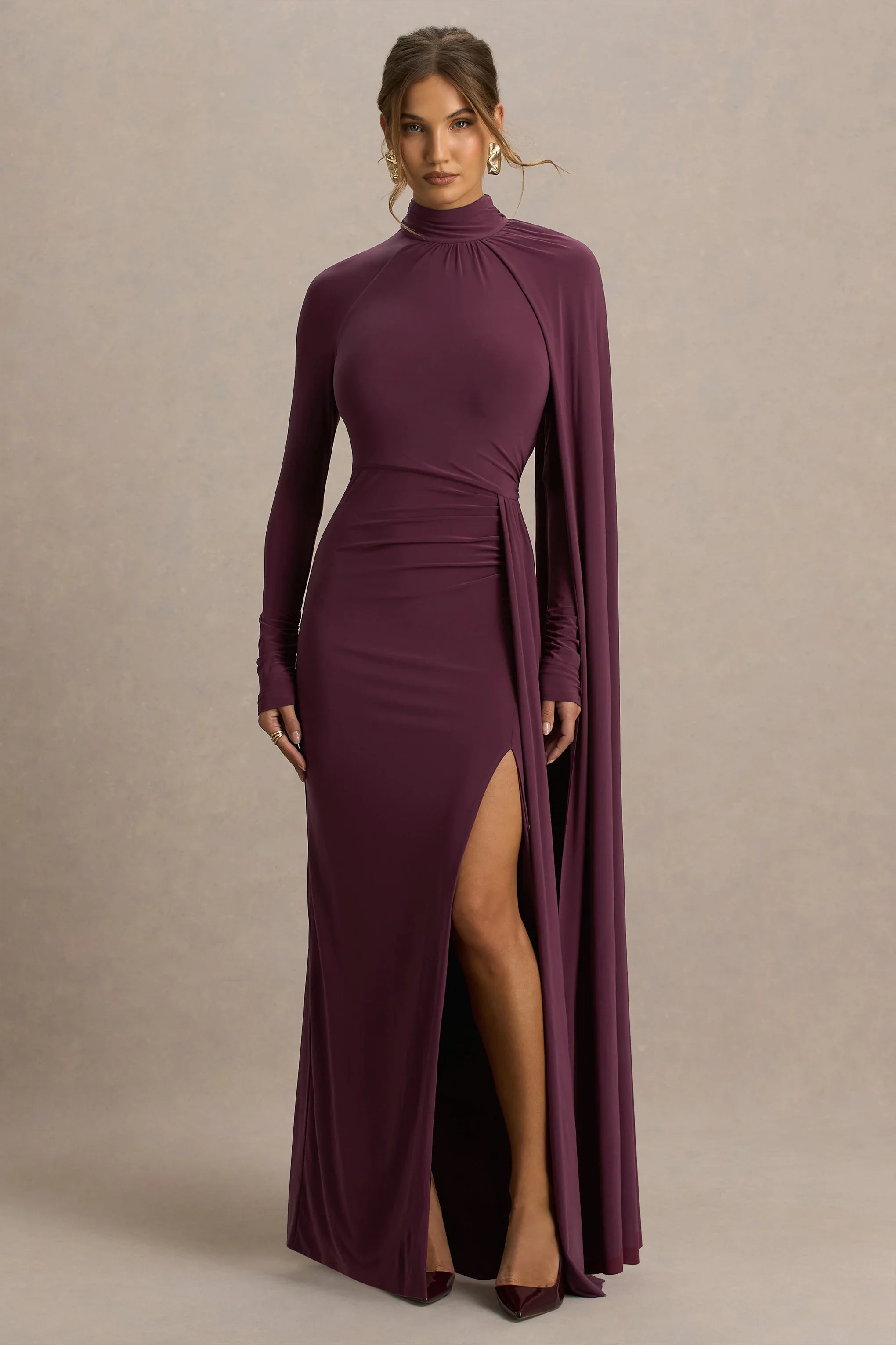 Own the spotlight in Anticipation, a sultry yet sophisticated showstopper made for after dark allure. Designed in a deep burgundy hue of our premium stretch jersey, this maxi dress is designed to sculpt and flatter. Featuring a sleek high neckline and long sleeves, that add utter elegance, and ruched detailing to enhance your silhouette. The front high split adds the right amount of drama, ensuring you exude confidence. Whether its a black tie event or a romantic date night, Anticipation ensures all eyes on you.