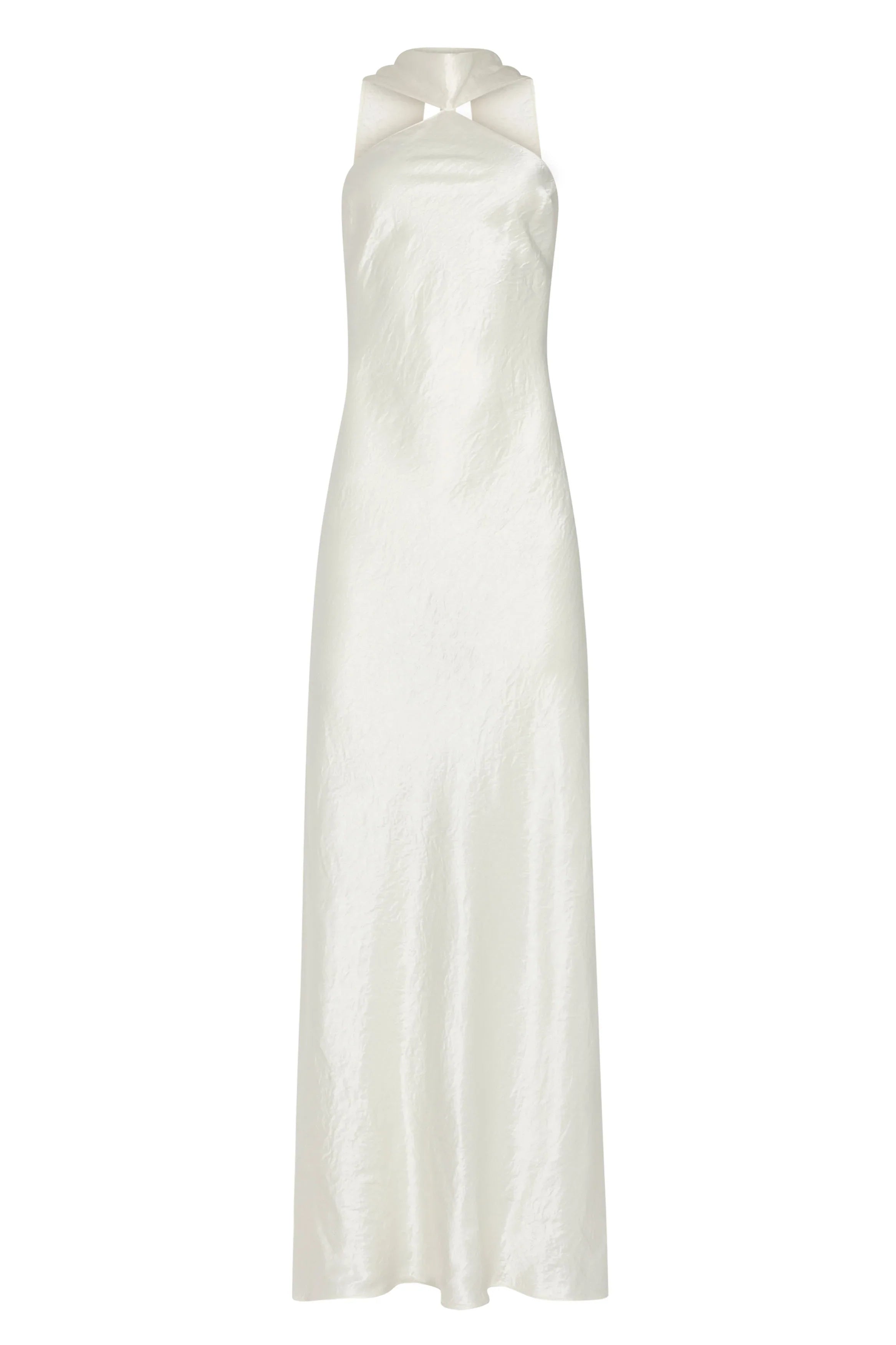 Leave your mark in the Ashton Maxi. Featuring a scarf-like neckline that drapes gracefully down your back, this textured satin dress is made for grand entrances. Pair with gold strappy heels for a fun yet elegant look.