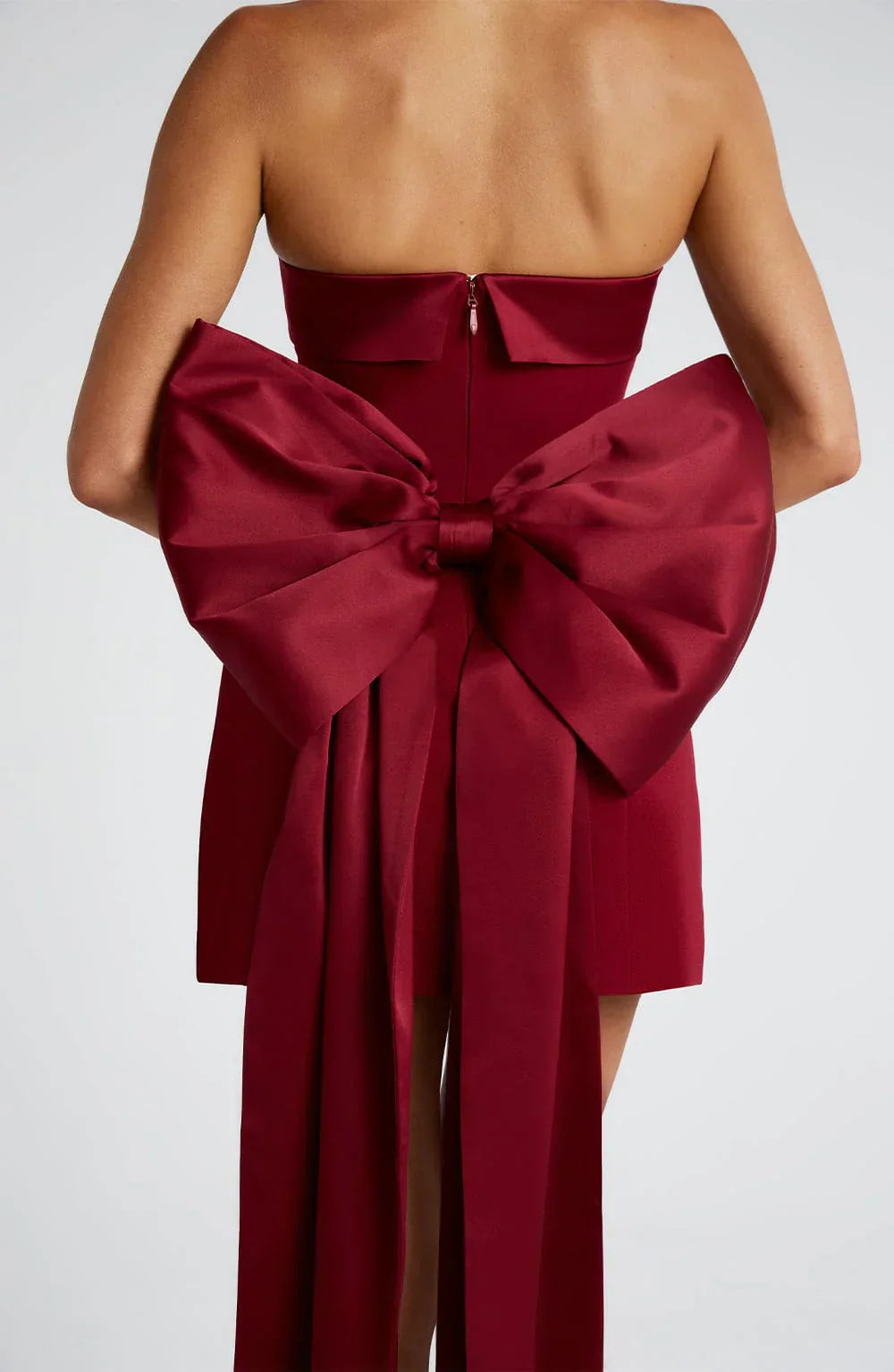 Turn heads in the Barbara Mini Dress in a rich wine hue. Crafted from luxurious non-stretch crepe with contrast satin details, this strapless mini dress features a flattering A-line silhouette and princess seams that sculpt the perfect fit. The show-stopping detachable bow cascades into dramatic long tails, ensuring an unforgettable entrance.