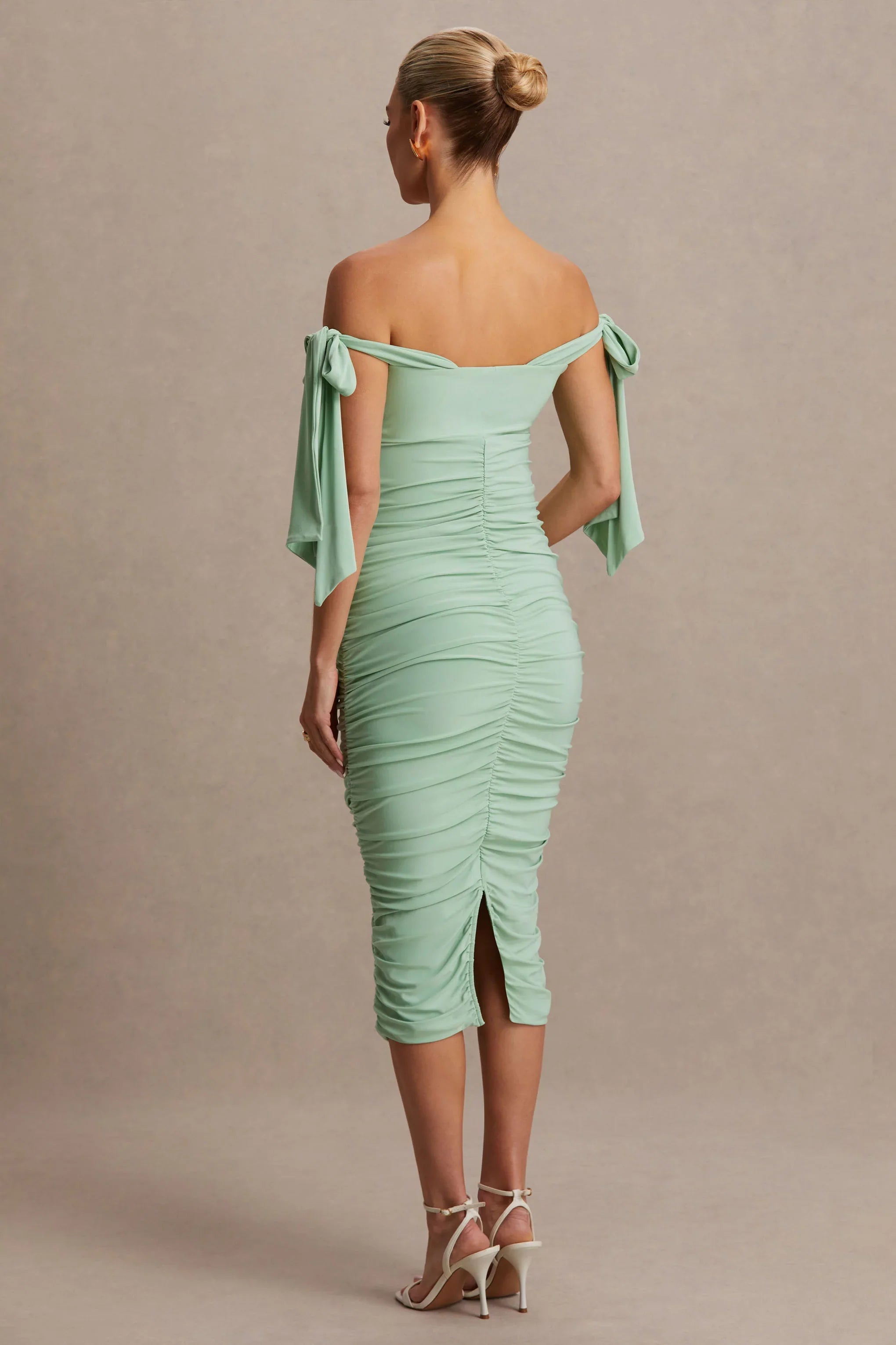 For an elegant yet playful look, Chandelier is the dress for you. This midi is cut in a bold light green shade of our premium stretch jersey, for an ultra flattering and sculpting finish. Designed with an elegant bardot neckline with statement bow sleeves, this head turning piece is delicate and feminine. The ruched details are perfectly placed to shape your figure gorgeously. For your next special occasion Chandelier is the perfect choice.