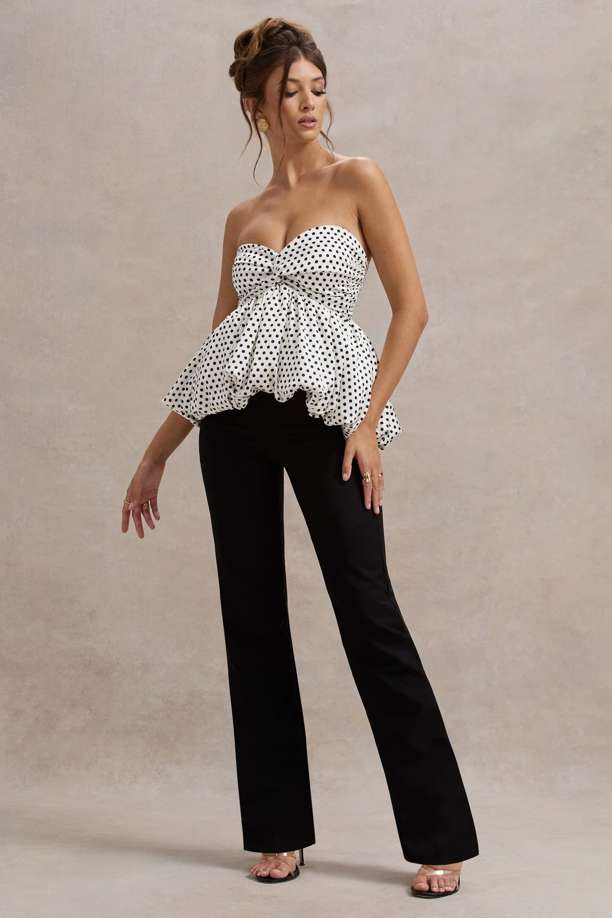 Step into effortless elegance with Divina. Our latest jumpsuit is crafted from premium black and white polka dot stretch crepe for a comfortable yet refined fit. This chic jumpsuit features playful ruffles and a flattering strapless design, perfect for making a stylish statement. Pair yours with bold heels and a matching clutch.