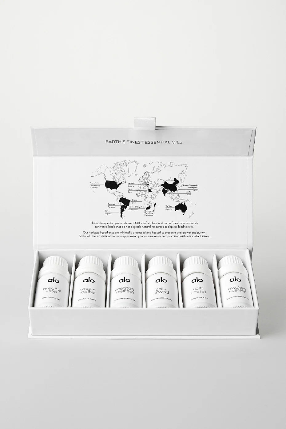Get the complete collection of 3 10ml single scents and 3 10ml Alo-exclusive blends for the ultimate assortment of scents to heighten or transform your mood. This luxe boxed set includes Energize & Refresh (Peppermint), Chill & Unwind (Lavender) and Awaken & Center (Eucalyptus), plus three powerful blends — Uplift & Reset, Breathe & Spa and Sleep & Soothe. Tune in yourself or give to others as the perfect mindful gift.