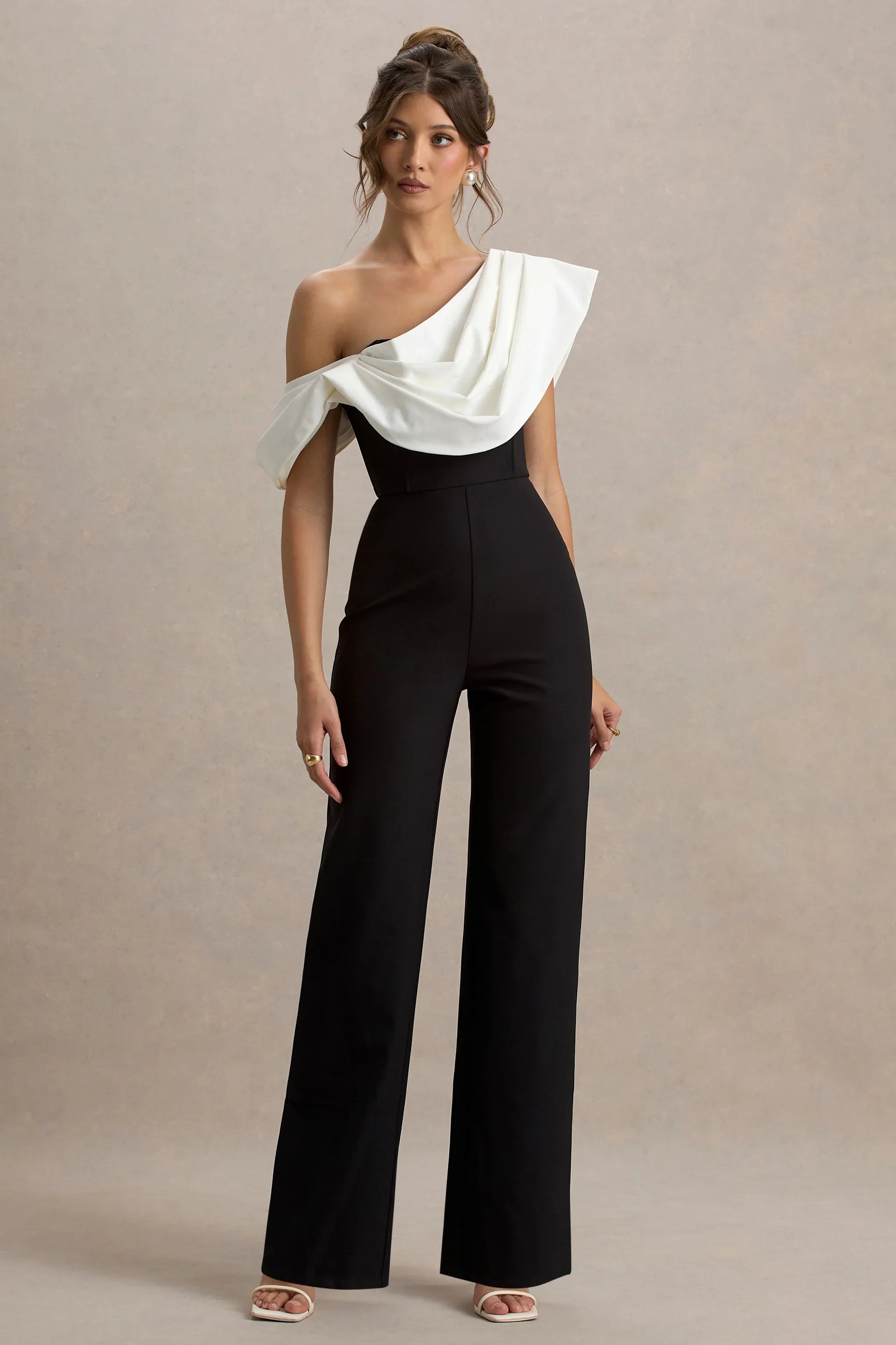 Strut with confidence in out Falling For You jumpsuit. Curated in a striking black and white contrast of our premium stretch crepe, this piece will flatter your figure like no other. Finished with a delicate, asymmetric drape detail that a romantic edge to this sleek piece. Style with heels and statement jewellery for your next dressed up occasion.