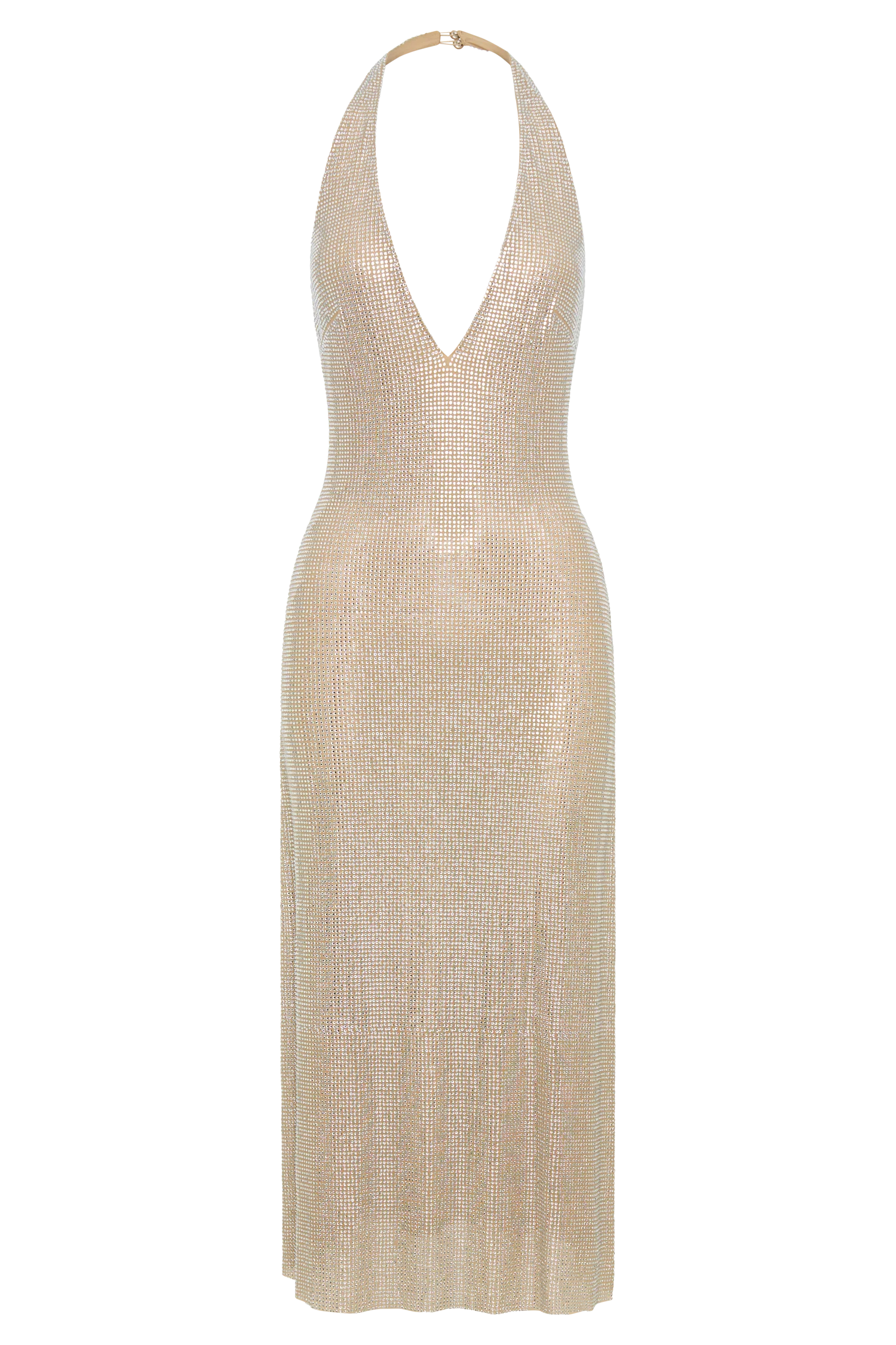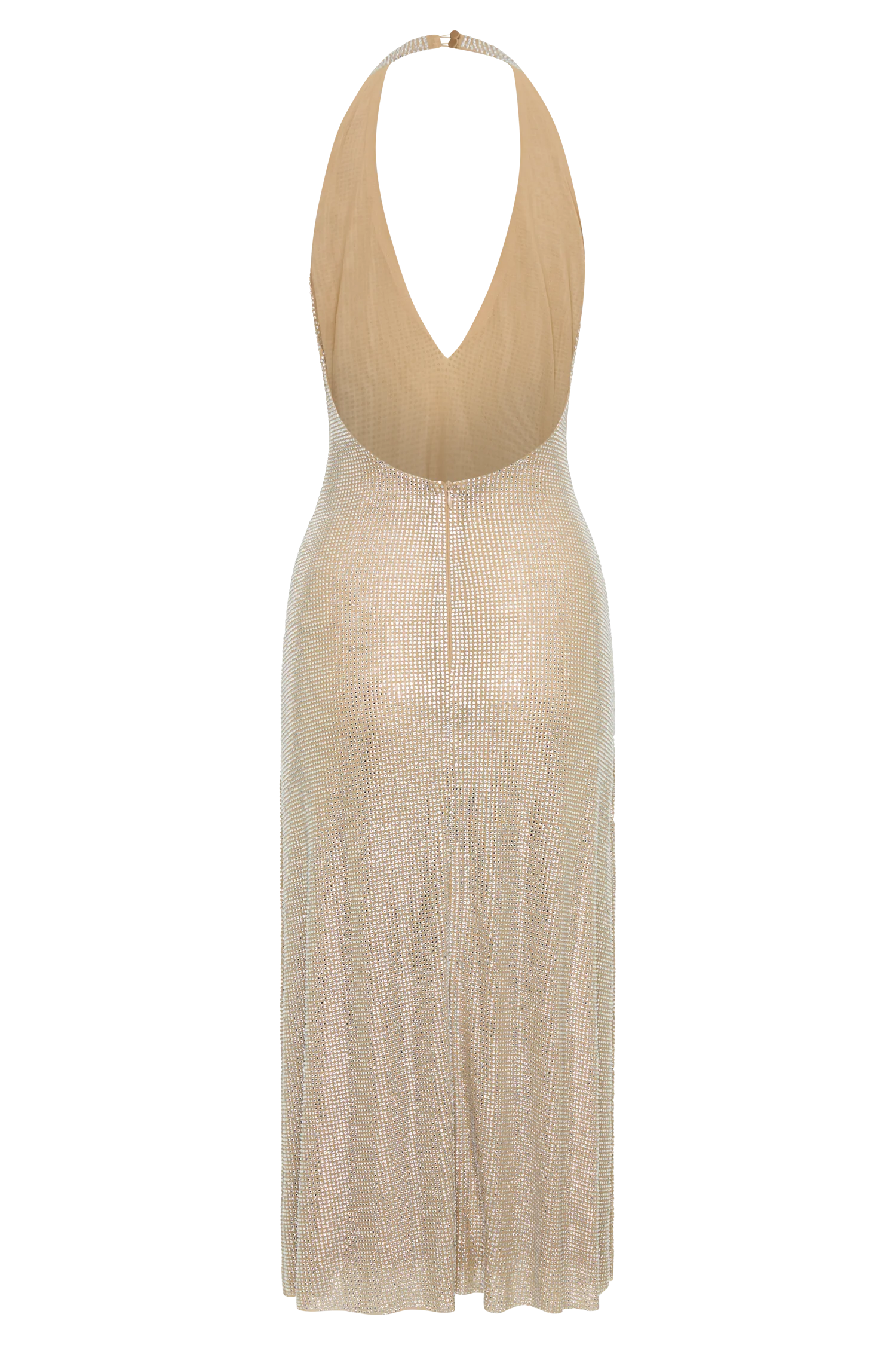 The GENIE Diamante Halter Midi Dress is a captivating blend of elegance and allure. Featuring a striking halter neckline, this dress beautifully accentuates your shoulders while the deep plunge length adds a daring touch. Designed to fit and flatter your figure, the fitted silhouette creates a stunning hourglass shape. Crafted from luxurious mesh diamante fabrication, this midi dress shimmers with every movement, ensuring all eyes are on you. Perfect for evening events or special occasions, the Genie dress is your go-to for making a memorable entrance.