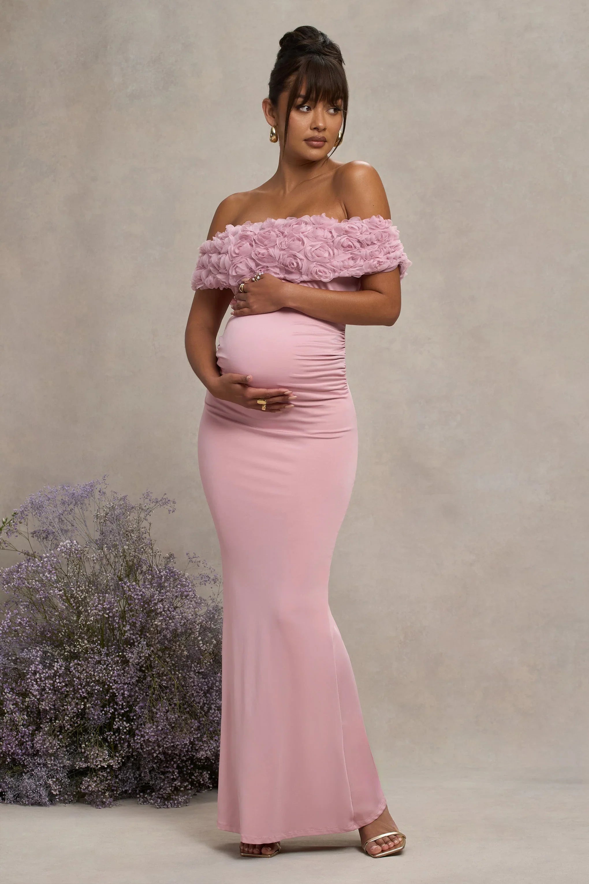 Both timeless and sophisticated, Inflorescence is a must-have maxi dress for any maternity wardrobe. Crafted in a premium stretch jersey known for its sculpting abilities, this form-flattering piece is defined by an artful array of mesh flowers across its bardot neckline. For an unforgettable wedding guest attire, try styling this fishtail maxi with some strappy heels and a classic sleek bun.