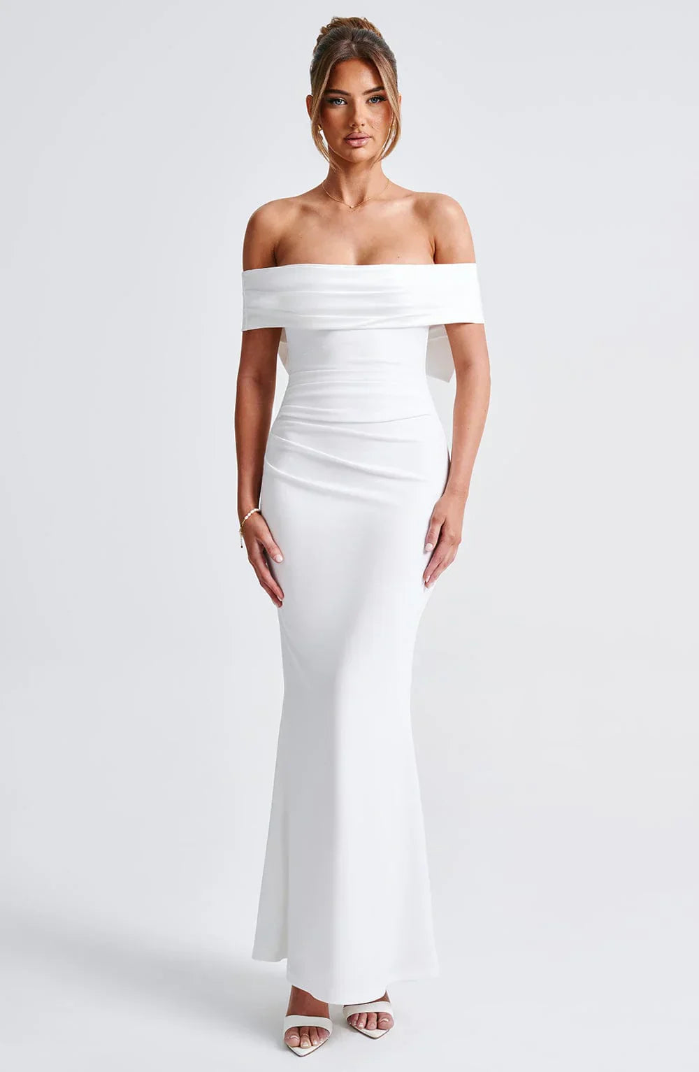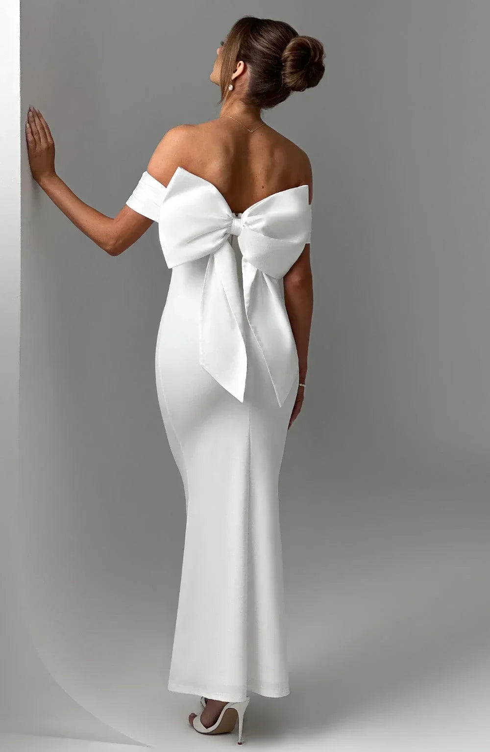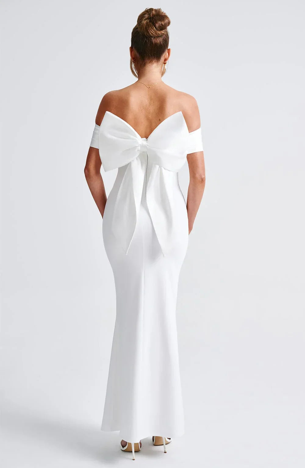 Introducing the dreamiest dress to say 'I do' in. Joanna is cut from our luxe stretch crepe that hugs the figure and flares gently at the skirt. It has a pleated satin bardot panel neckline with stunning removable bow to the reverse. It's complete with pleats to the waist.