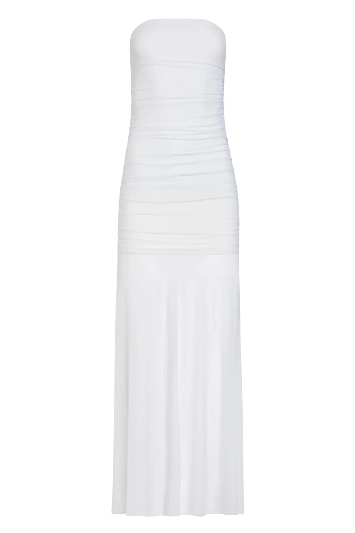Make them look twice in the Leo Dress. This strapless maxi hugs your curves and flows into a sheer skirt with just the right amount of drama. Pair it with sleek heels and a statement clutch for a standout look.