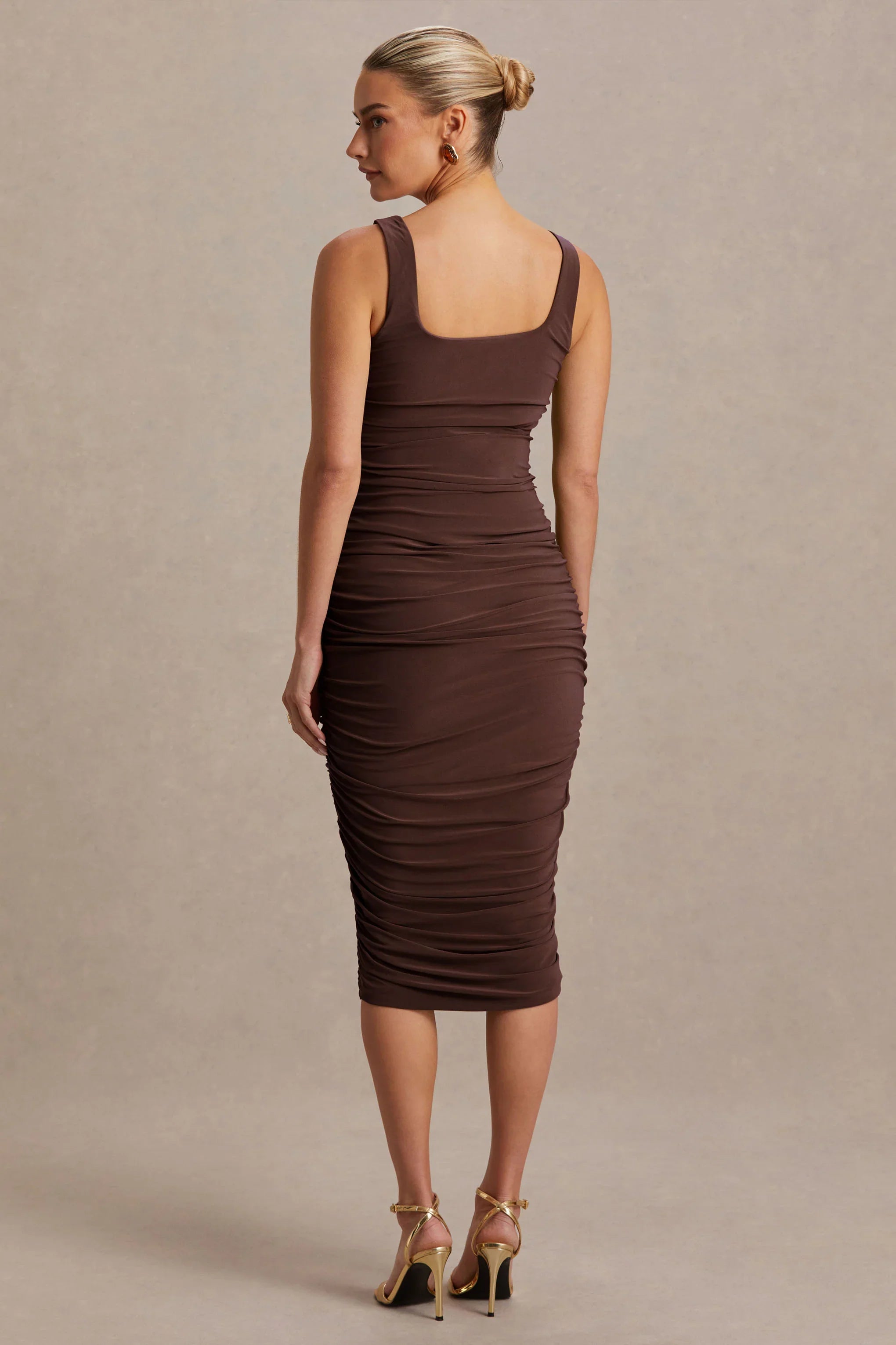 Named after the romantic Portuguese capital, our Lisbon midi dress would make a fine baby shower option for any glamorous mother-to-be. The brown maternity dress is made from premium stretch jersey to flatter your bump as well as your figure. This bestselling bodycon also features a square neckline with thick straps and plenty of ruching throughout.