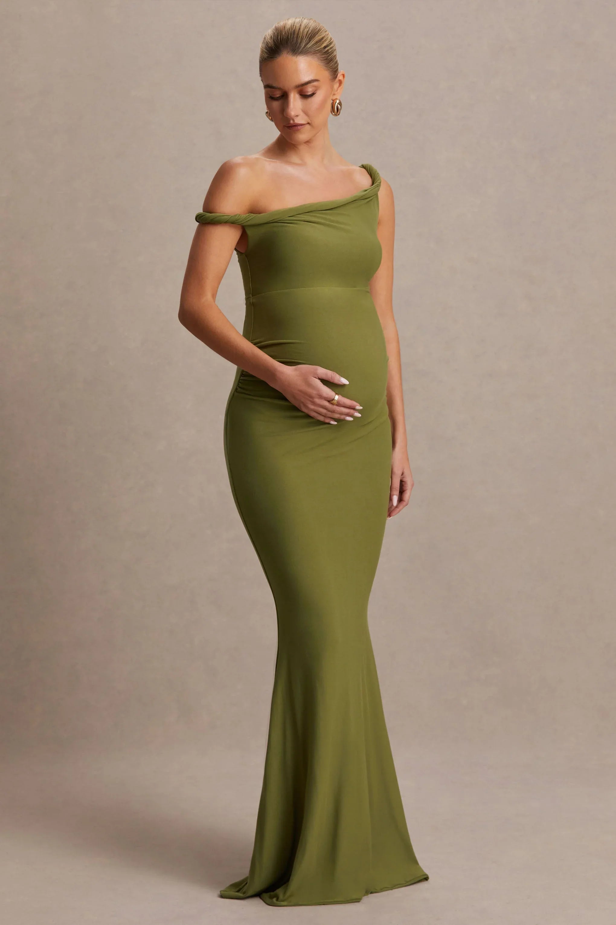 The latest must have maxi of the season is Lita. This maternity maxi dress has been cut in a deep olive shade of our premium stretch jersey that hugs every curve. Boasting a twisted asymmetric neckline, style this stand-out staple with a tousled bun and some gold accents for a classic look.