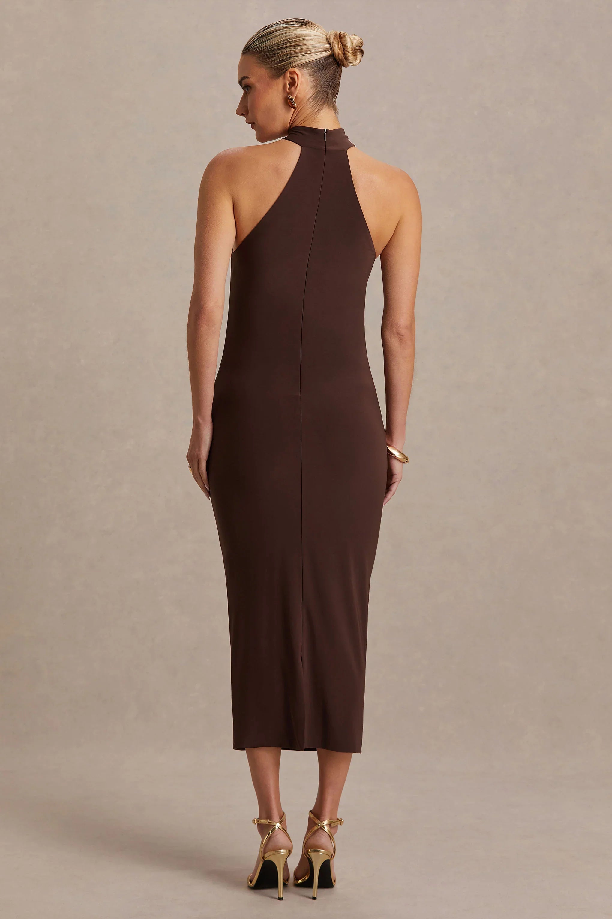 Say hello to Mireille, a maternity midi that blends comfort with timeless elegance. Cut from our premium brown stretch jersey, this dress is designed to flatter your bump at every stage. The halter neckline adds a sleek touch, while ruched detailing enhances the silhouette with a soft, sculpted effect. Finished with a centre-back split for ease of movement and a midi length for versatile styling, Mireille is the ultimate maternity go-to for chic occasions.