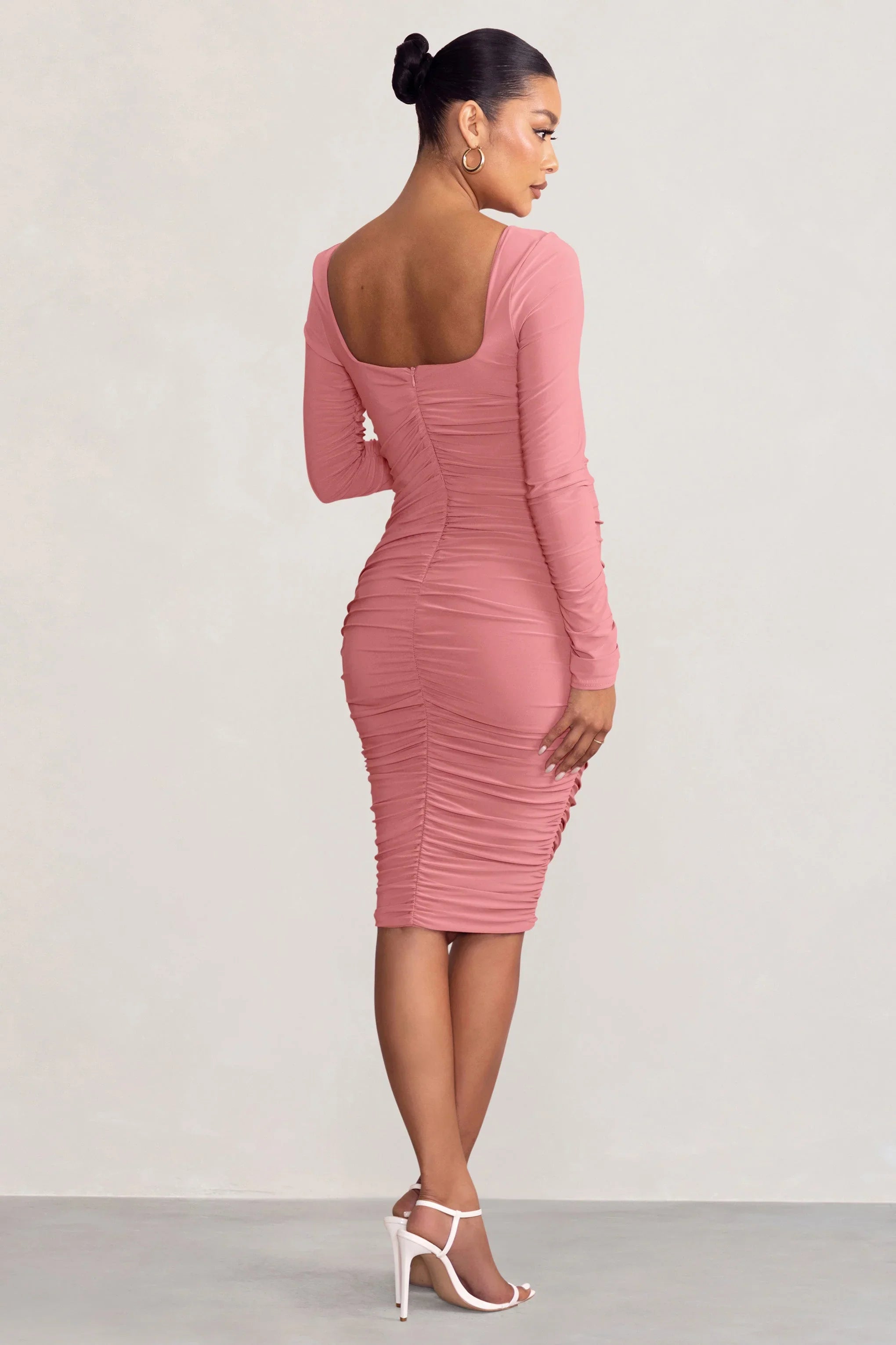 Give your blossoming body the attention it deserves in a stunning midi dress like New Life. Sculpting your figure in our signature stretch jersey, this nude pink dress comes with a square neckline, long sleeves and plenty of ruching. Pair New Life with strappy stilettos and gold hoops for the perfect baby shower outfit.