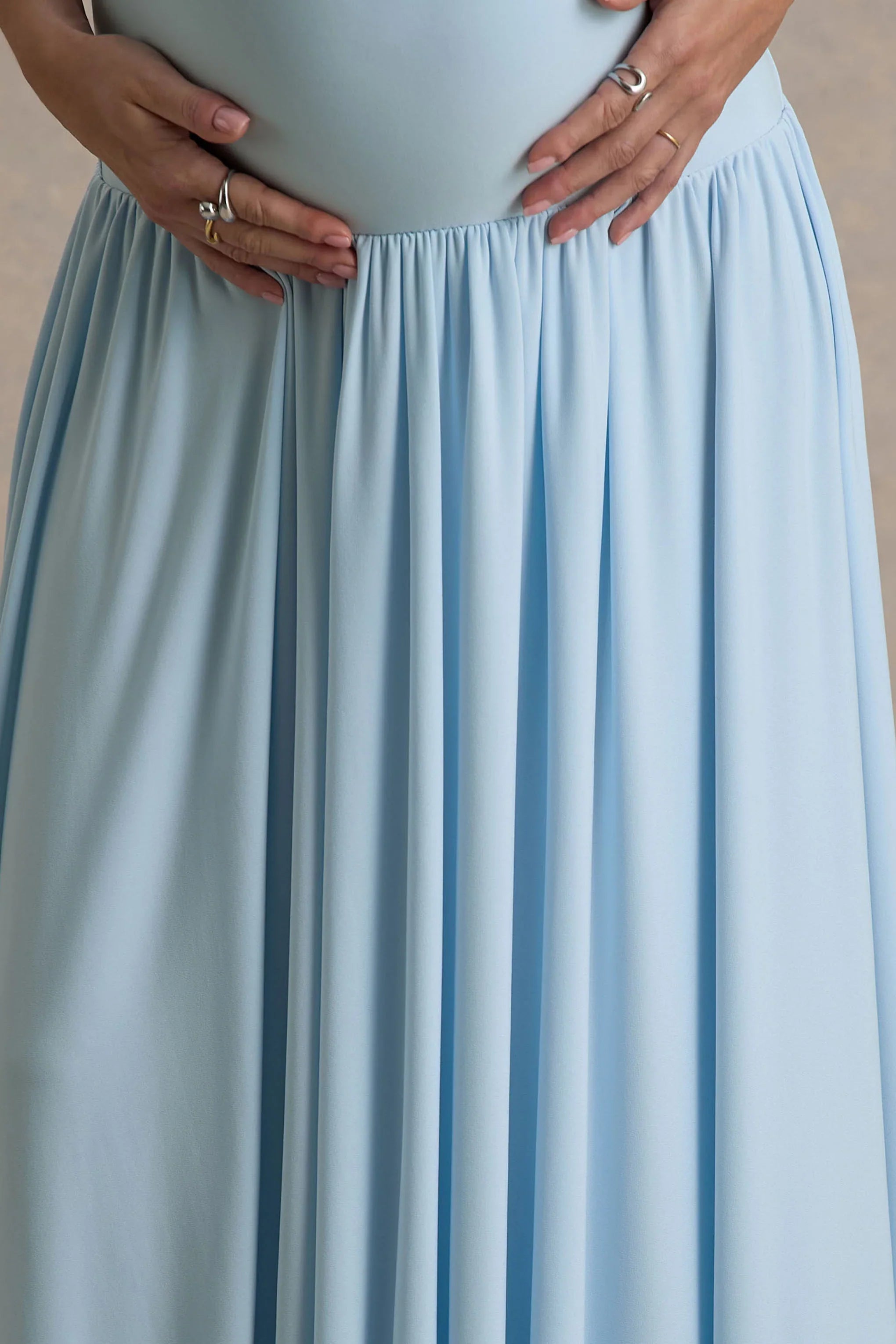Introducing Outline, the ultimate maxi dress designed to flatter you're growing bump in style. Crafted from our premium stretch jersey in a dreamy powder blue hue, this elegant piece offers both comfort and elegance. Featuring a chic crew neckline and expertly placed ruching that flatters your figure. Outline is the perfect piece for baby showers, special occasions and any other dressed up moment where you want to feel effortlessly glamorous. Style with gold jewellery and radiate confidence.