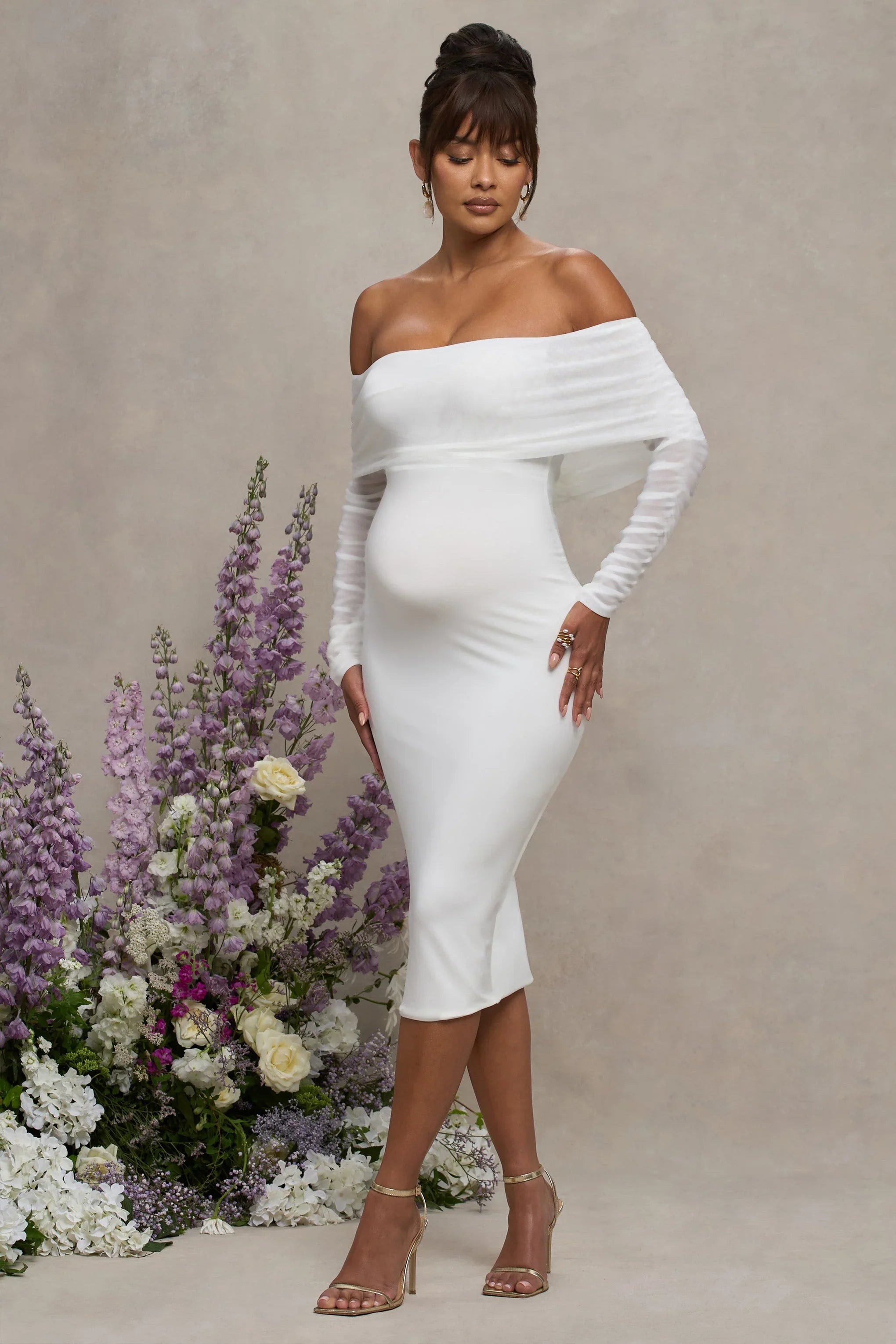 Classic and sophisticated, Patiently Waiting is the perfect option for your upcoming baby shower. Crafted in a soft white shade, this maternity midi dress is defined by a mesh bardot neckline and long, sheer sleeves. Keep Patiently Waiting at the forefront by styling it with a sleek bun and strappy stilettos.