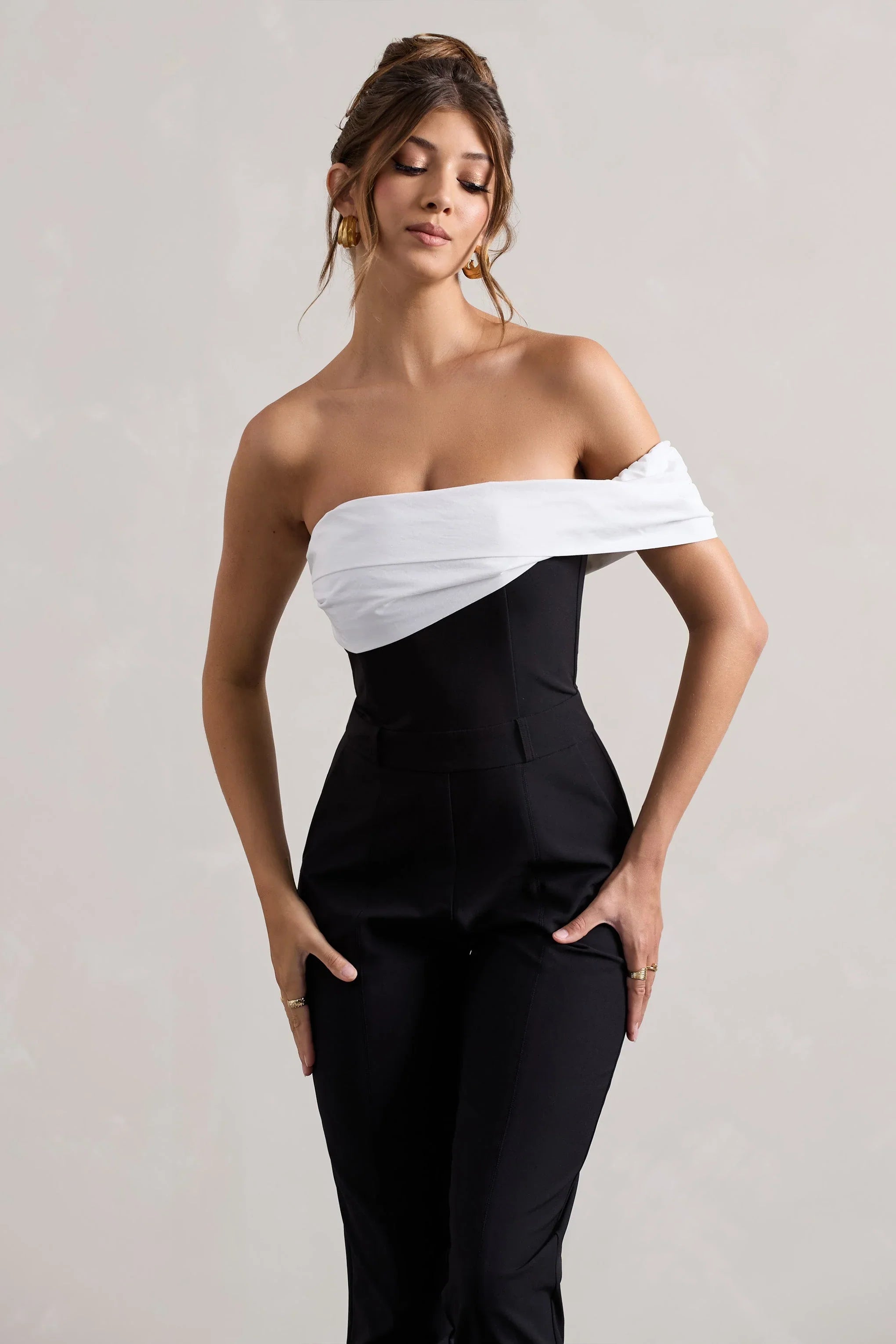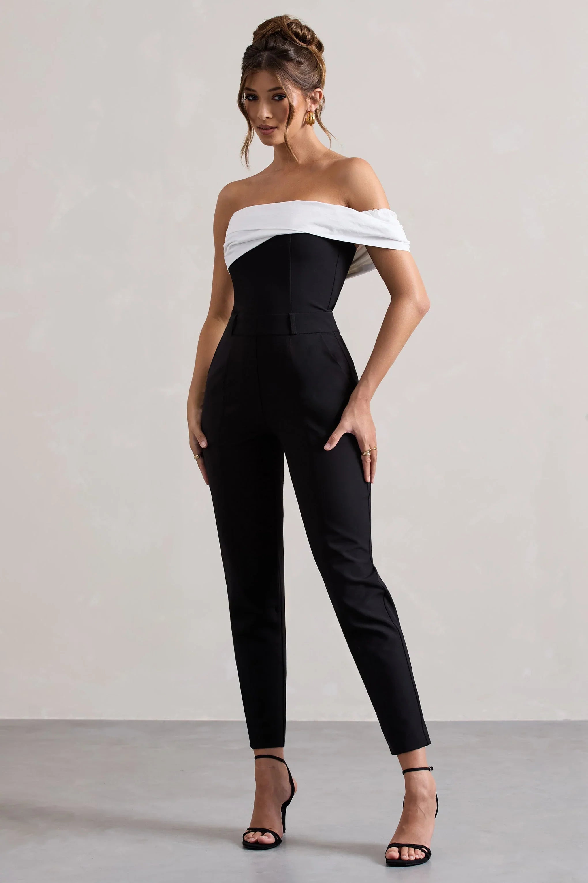 A strapless staple, prepare to look polished in Paxton. This black tailored jumpsuit has been cut in a premium crepe, featuring a flattering bardot neckline enhanced with twisted detailing. Finish off your look with our Hear Me court heels for a sophisticated ensemble.