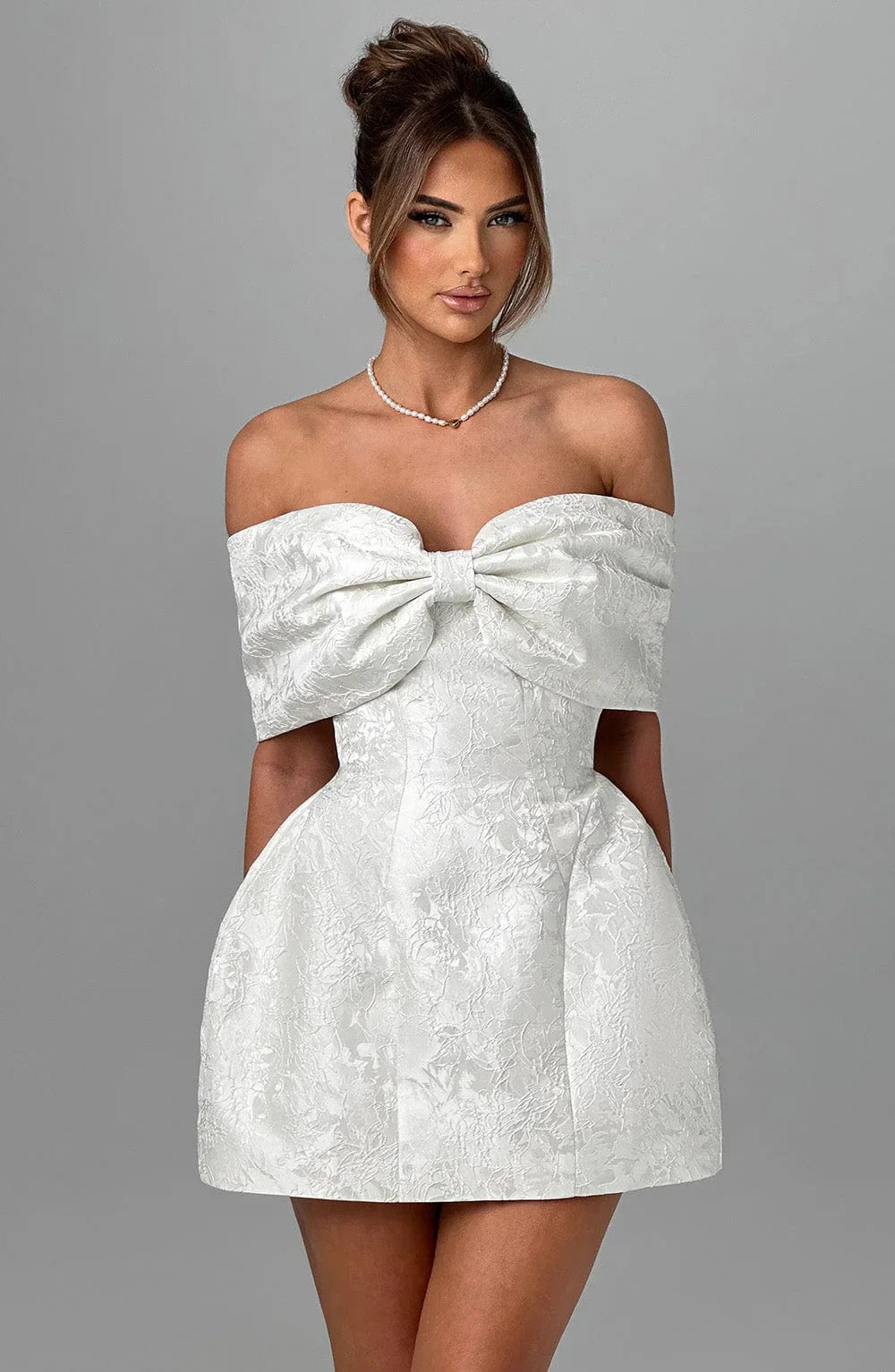 A stylish but oh-so-romantic design, Raquel is a showstopper for your big day. Cut from beautiful floral jacquard fabric, it features an off-the-shoulder bardot bow neckline to flatter the decolletage. The mini dress is complete with a tulip shaped skirt and lace up back for your perfect fit. Style with flower-adorned heels and pretty waved hair.