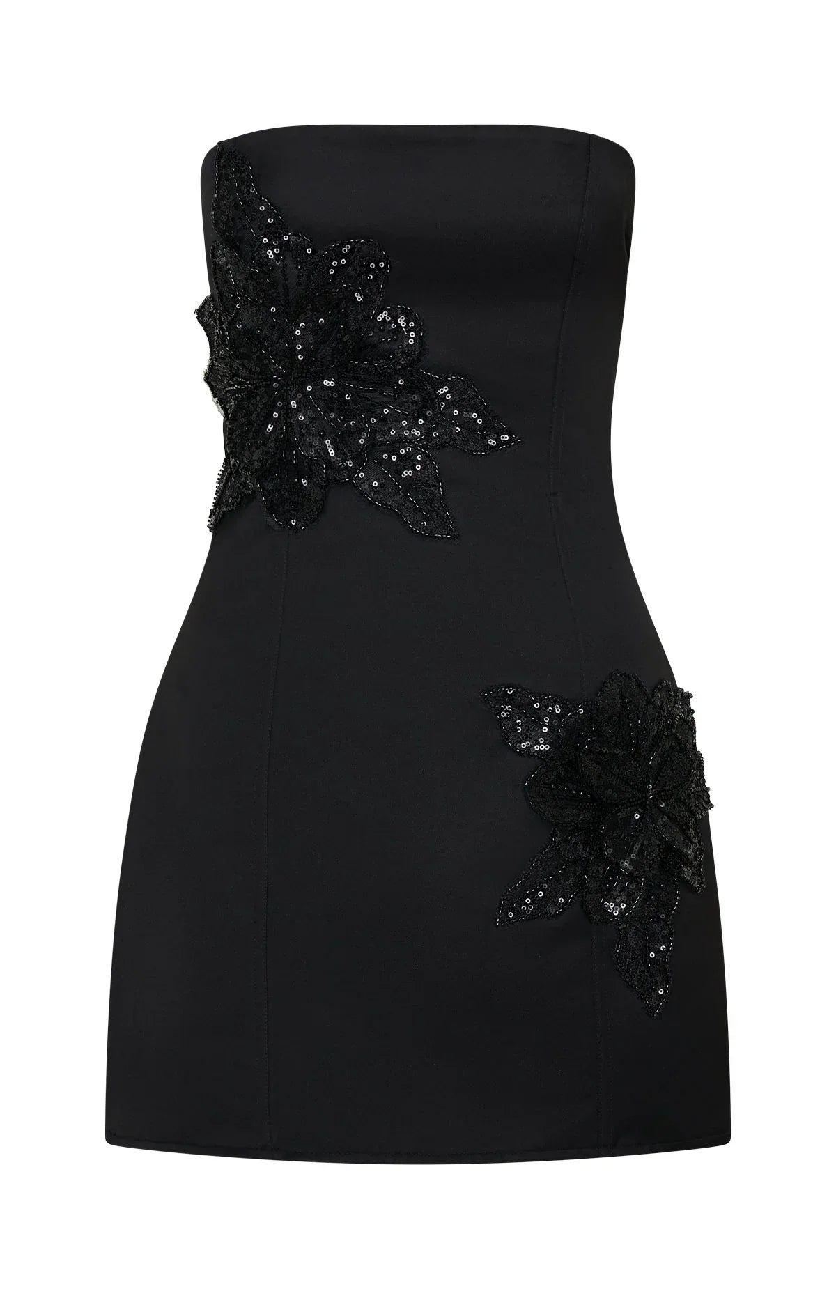 Elevate your spotlight moment in the Rendezvous Strapless Mini Dress in Black! It features a strapless neckline with grip tape, a figure-hugging silhouette, and a corset-inspired lace-up back. Floral appliqu'''s with sequins add romantic detail, while an invisible zipper keeps the look seamless. Style it with paired-back heels and statement jewellery to turn heads.