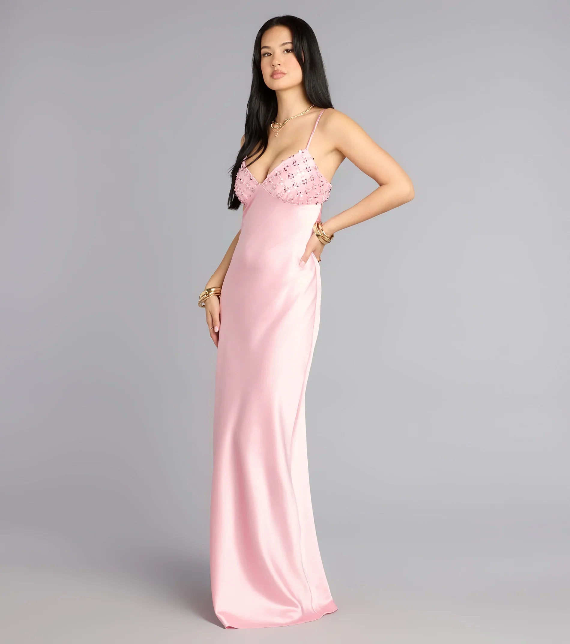 Polished with a soft, luminous allure, the Ruby dress is designed for evenings that call for effortless sophistication. Crafted in satin fabric, this column floor-length silhouette features a sequin beaded mesh V-neckline bust, delicate adjustable spaghetti straps, and a low back cowl detail that feels refined yet memorable.