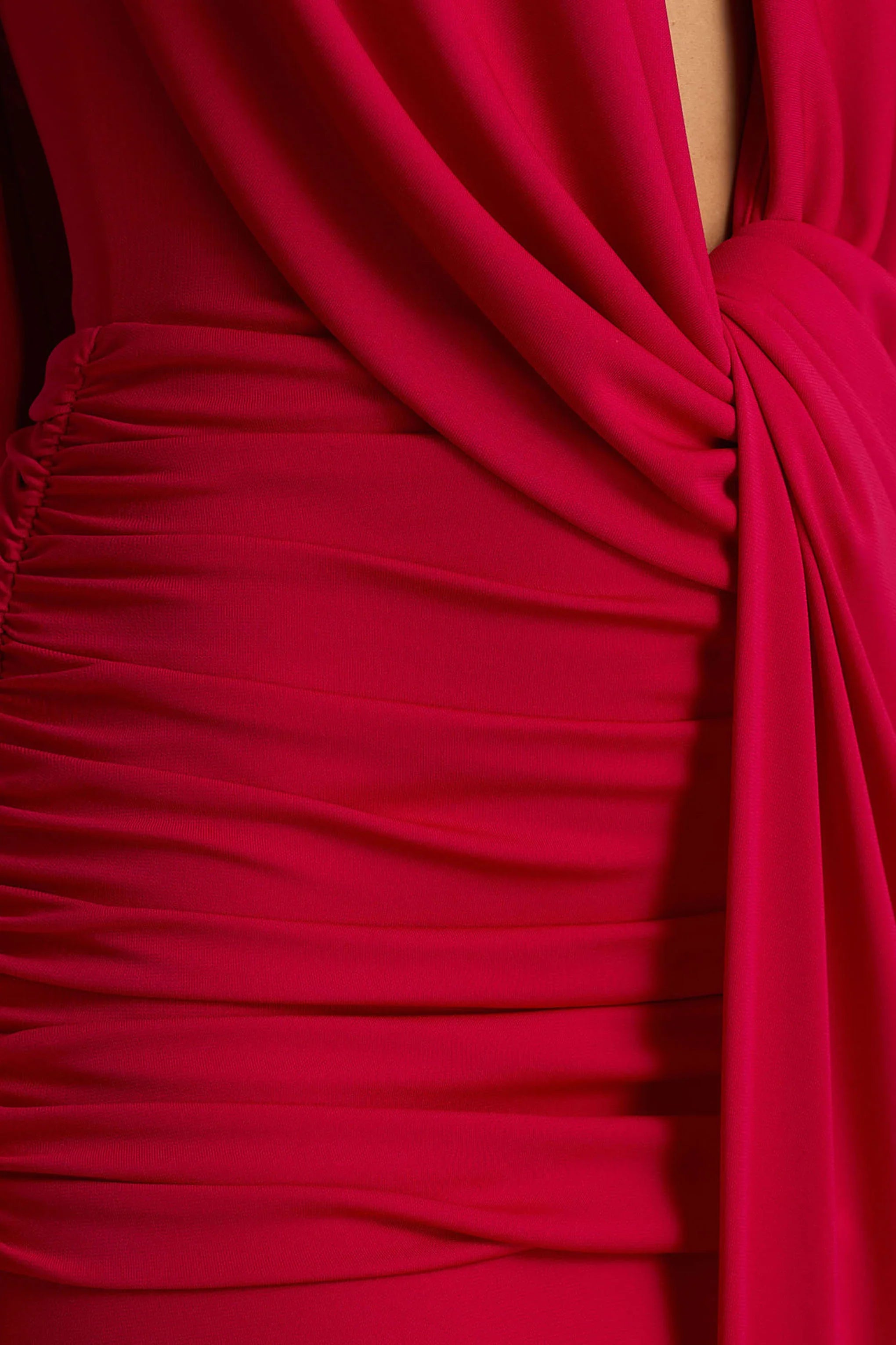 Turn heads in Serafina, a showstopper designed to captivate. Crafted from our premium stretch jersey, in a rich red shade, this maxi dress skims and sculpts your figure seamlessly. The extreme plunge neckline brings high-impact drama, perfectly balanced by a wrap front that cinches the waist and enhances your curves. Ruched detailing flatters the form, while the back features a statement cowl drape and adjustable self-tie detail for a custom fit. Serafina is elegance turned all the way up.