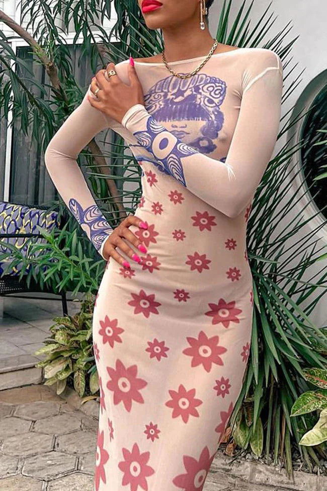 Spice up your beach vacation outfits with our stunning sheer dresses this summer. This sexy sheer maxi dress in our boutique is a showstopper! Featuring a sleek bodycon silhouette, a chic round neck, and long fitted sleeves, this see-through mesh maxi dress has a daring open V back design that adds a touch of allure. The stunning contrast floral print against the apricot background creates a harmonious blend of boldness and femininity, making this fantastic dress a perfect choice for fashion-forward women. Pair it with your fav bikini sets to complete the look.