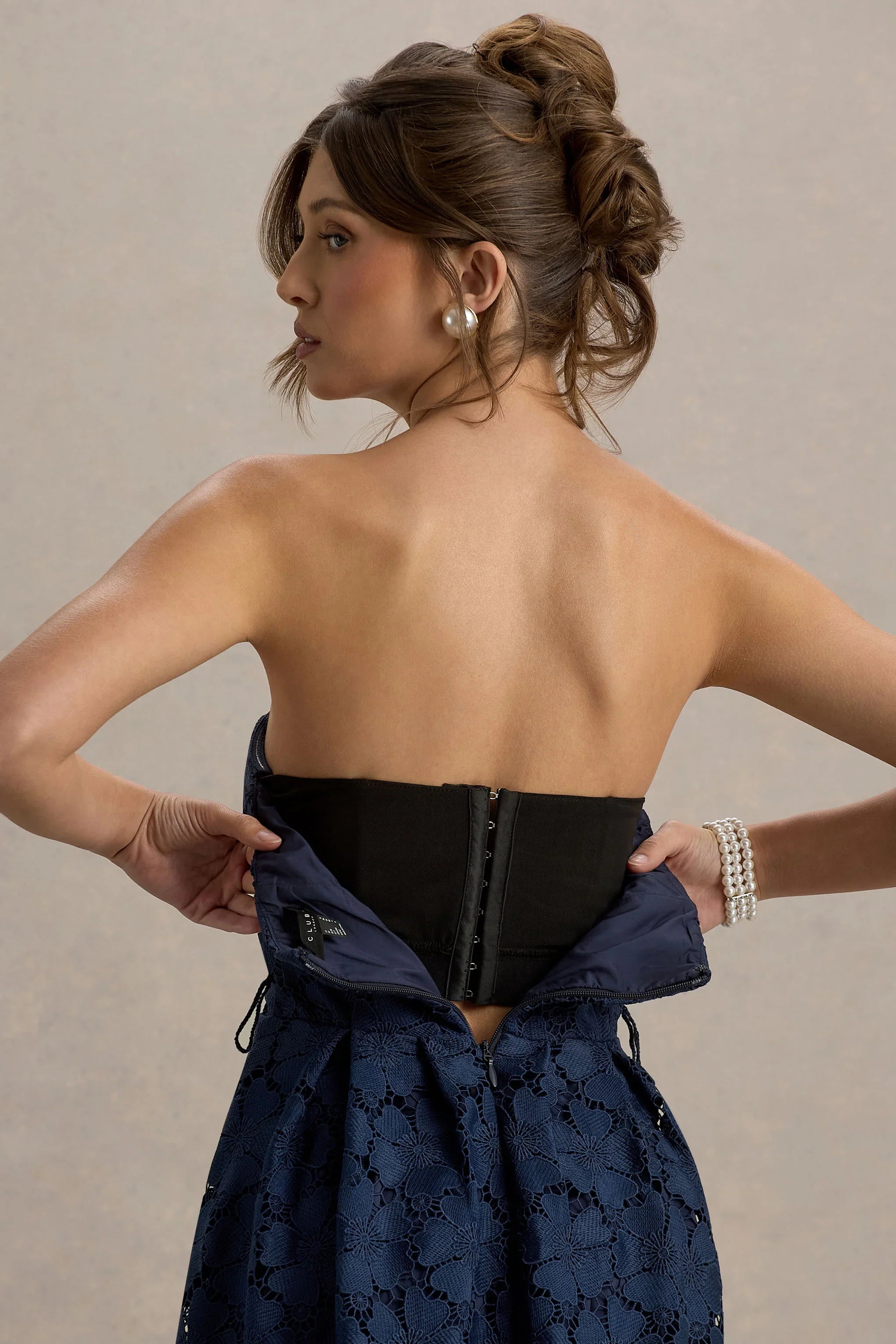 For a look that is feminine and graceful, Shania is the piece you need. Curated from our premium lace, in a rich navy hue, this midi dress exudes elegance. The bandeau neckline delicately frames your shoulders while the eye catching satin belt cinches in your waist, complimenting your curves beautifully. This dress moves with you effortlessly, ensuring an utterly sophisticated finish. From race days to elegant dinner parties, Shania is perfect for any dressed up moment.