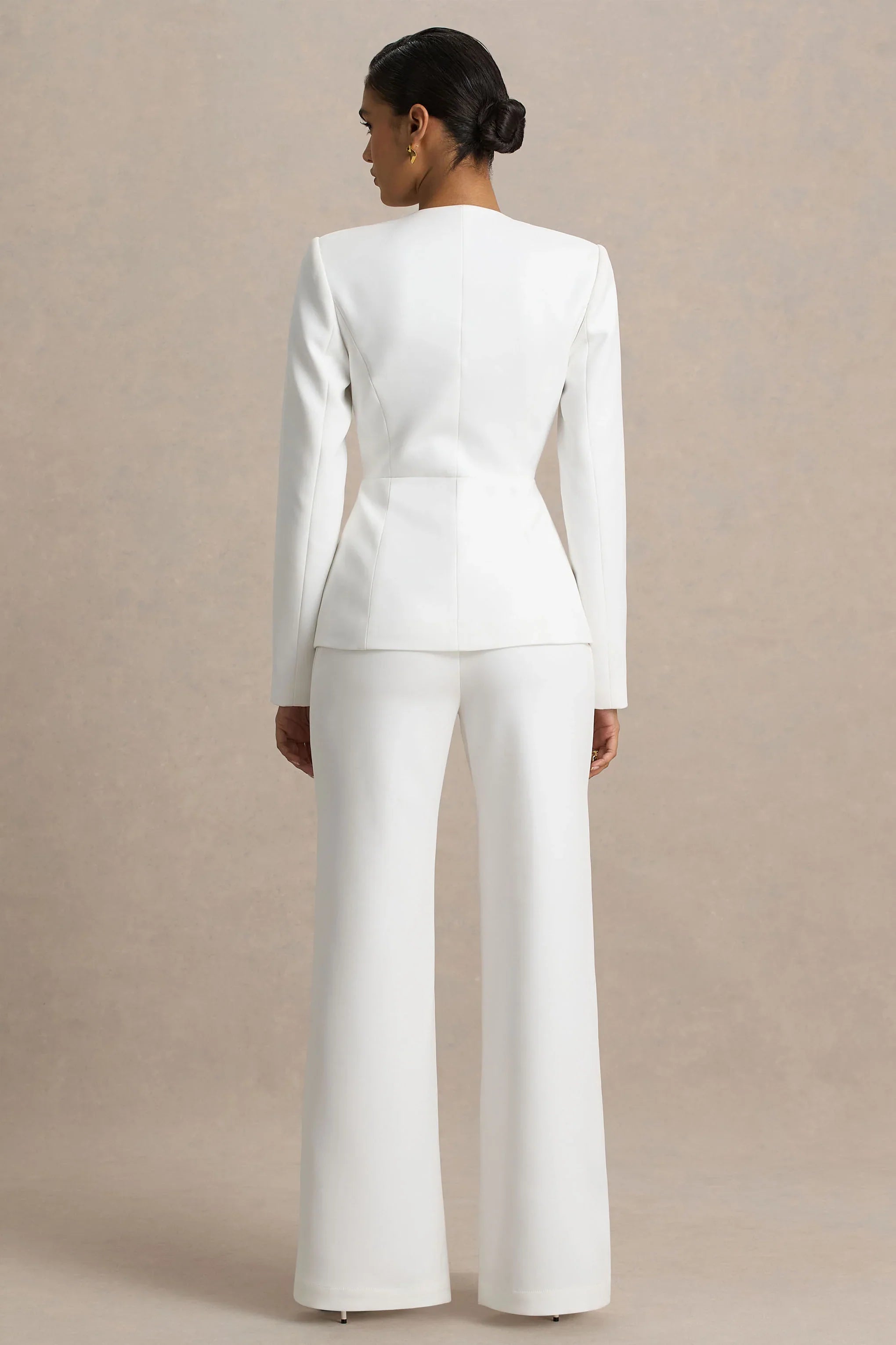 Introducing Silvia, a versatile wardrobe staple that's tailored to perfection for modern elegance. Crafted from our premium stretch crepe in a classic white hue, these trousers are designed to flatter while exuding timeless sophistication. Featuring angled pockets that nod to sleek tailoring and a fluid wide-leg silhouette that elongates the frame, Silvia transitions seamlessly from desk to dinner. Pair with our Rosalina blazer for a look that'll command attention.