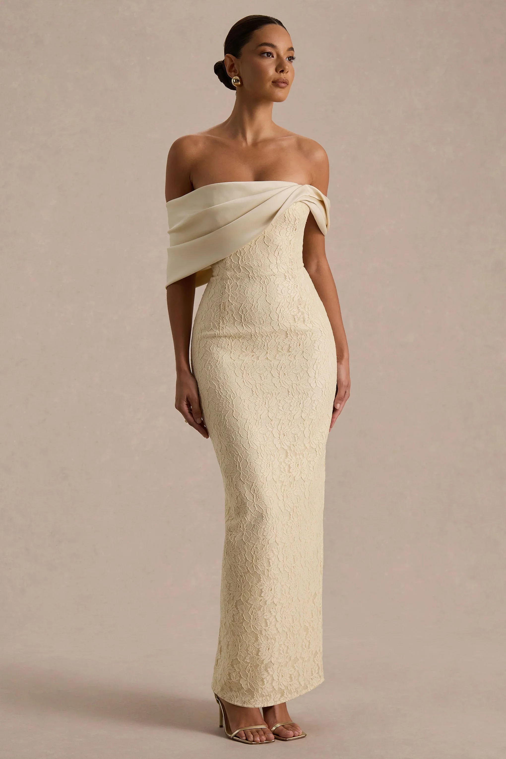 Effortless elegance meets modern romance in Solora. Crafted from our premium cream lace, this maxi dress is all about timeless glamour. Featuring a twisted bardot neckline that frames the shoulders, while the centre-back split adds a subtle touch of drama. Flowing, feminine, and unforgettable, Solora is the ultimate choice for evenings where sophistication and statement style collide.