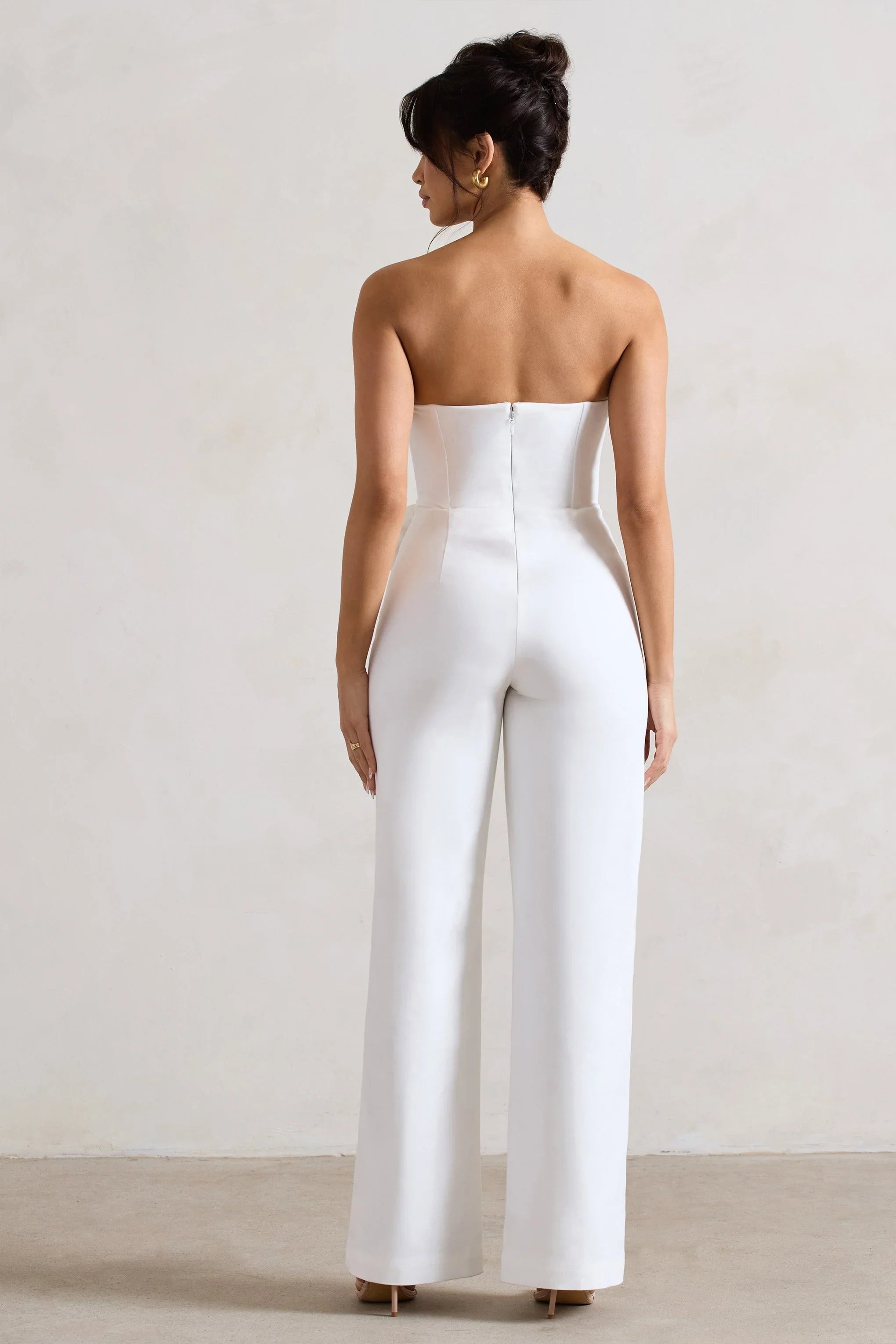 Show off your sophisticated silhouette in Sonia, our white straight-leg jumpsuit. Expertly cut in our premium cotton blend, Sonia features a sweetheart neckline and contemporary corset style bodice that accentuates your curves. This style is finished off with some floral corsages delicately displayed on the waist. Style this elegant jumpsuit with a sleek bun and our Catcher heels for your next event.