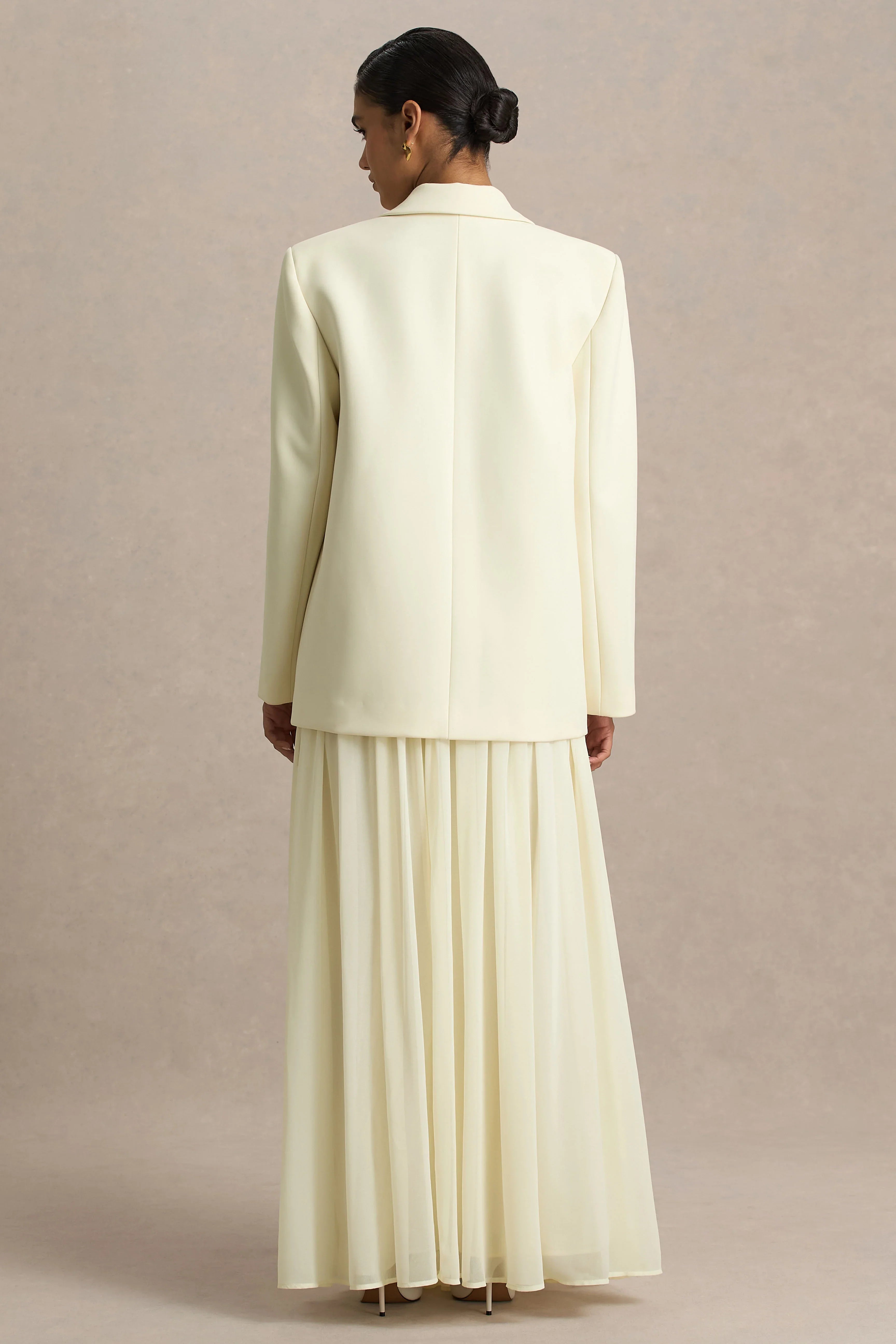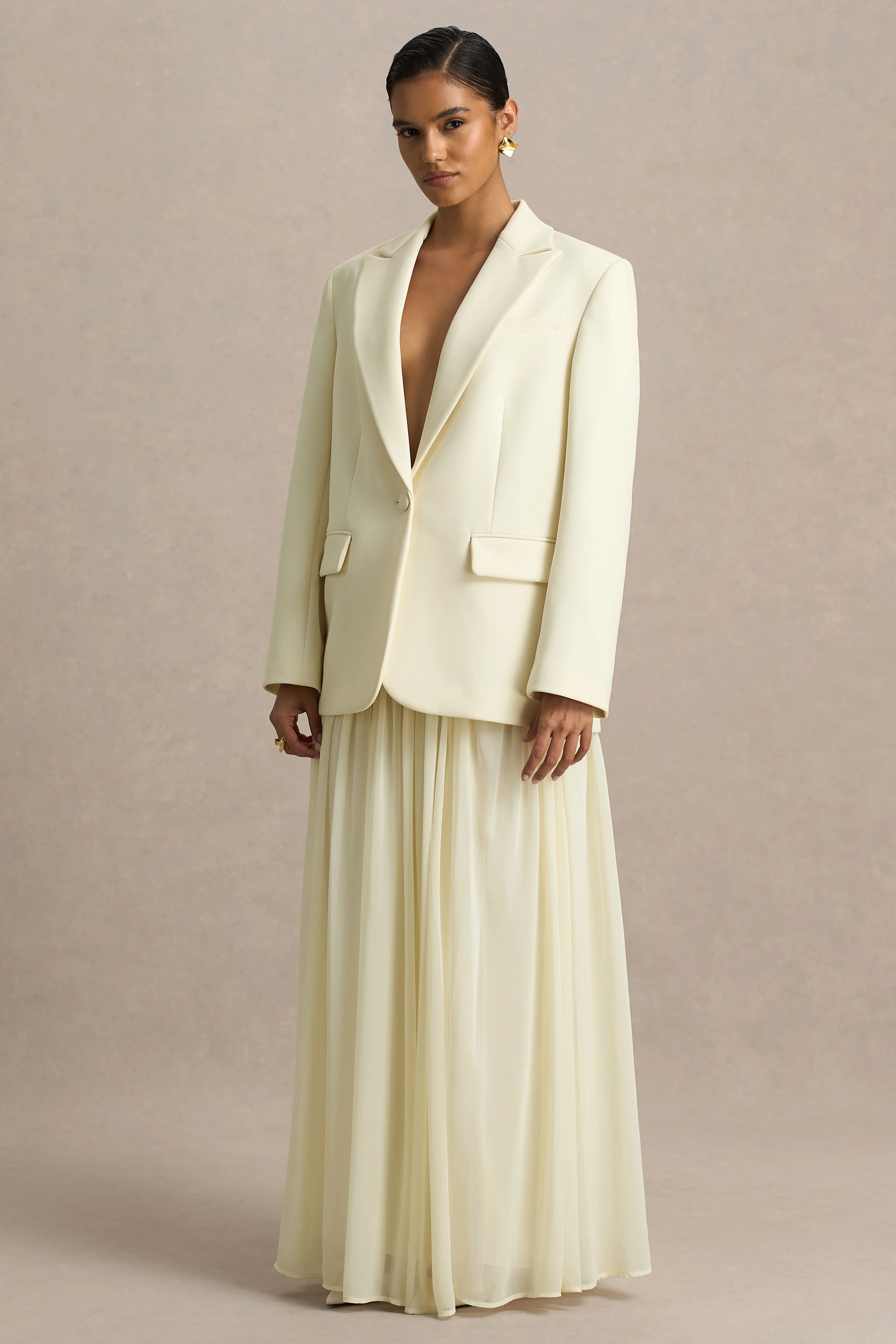 Spencer is the epitome of effortless elegance. Crafted in our soft cream premium chiffon, this maxi skirt features delicate pleated detailing and a daring front high split for a flirty, feminine finish. Flowing with every step, it’s perfect for turning heads at any event this season. Lightweight, graceful chic, Spencer adds a touch of sophistication to any look.