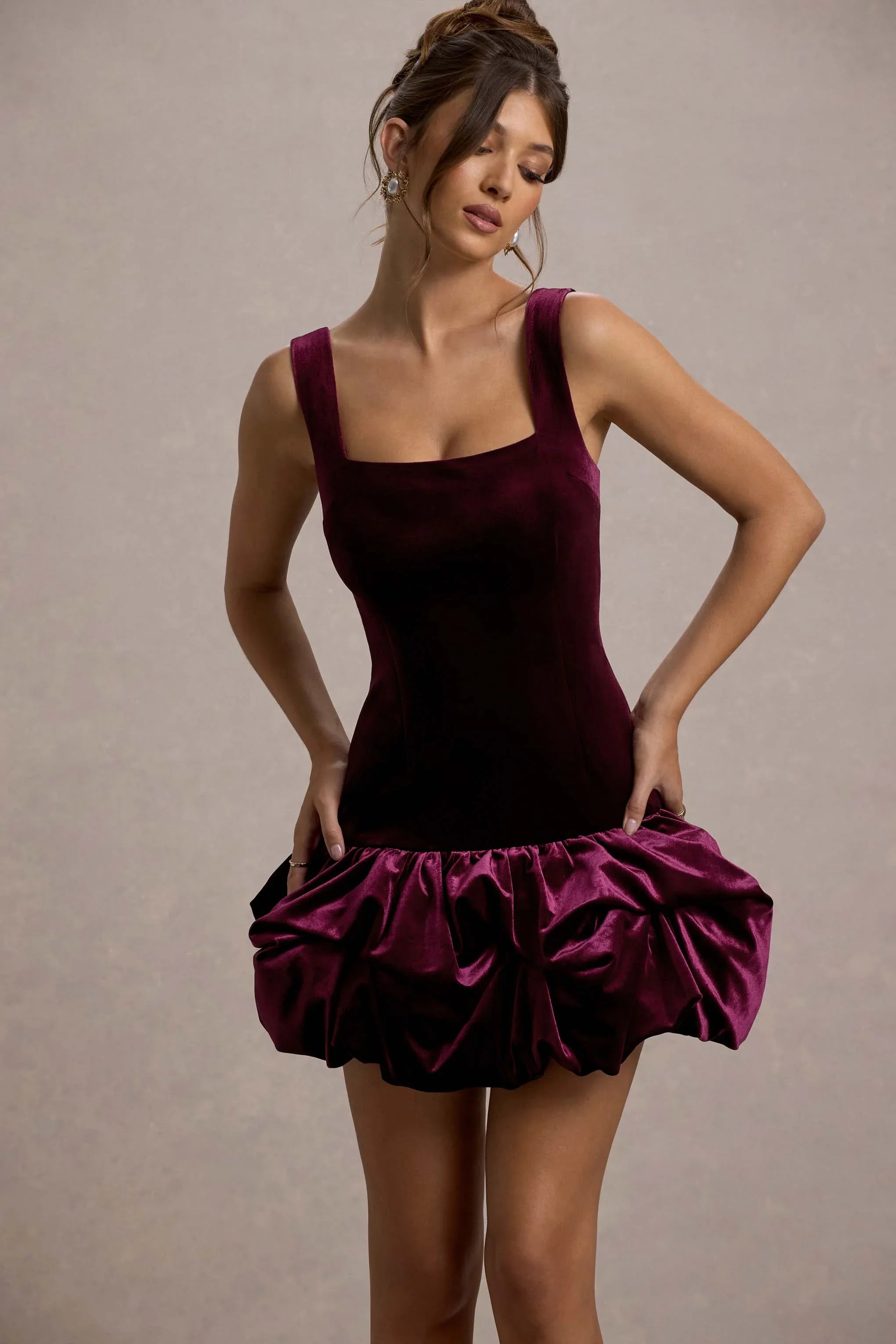 A mini every party girl should have, say hello to Sutton. Expertly designed in a deep port shade of premium velvet, this figure-skimming bodycon boasts a classic square neckline, wide shoulder straps and artful puffball hem.