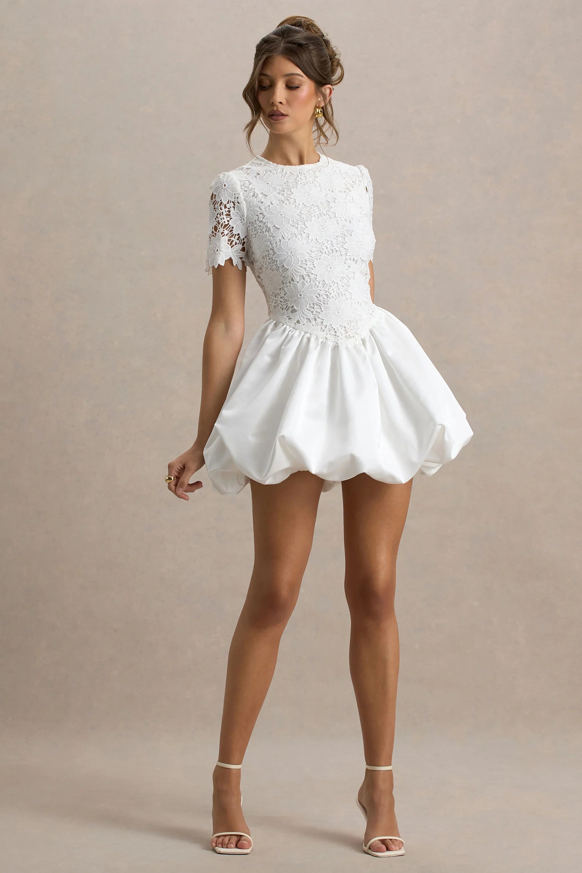 Sweet yet statement-making, Taffy is the ultimate mini for those who love to turn heads. Designed in a dreamy white satin and delicate lace, this playful yet elegant dress features a chic crew neckline and a voluminous puffball skirt for a striking silhouette. Perfect for summer nights when you want to make a bold entrance. This piece perfect fusion of romance and modern femininity that you need in your rotation, just add heels and let the dress do the talking.