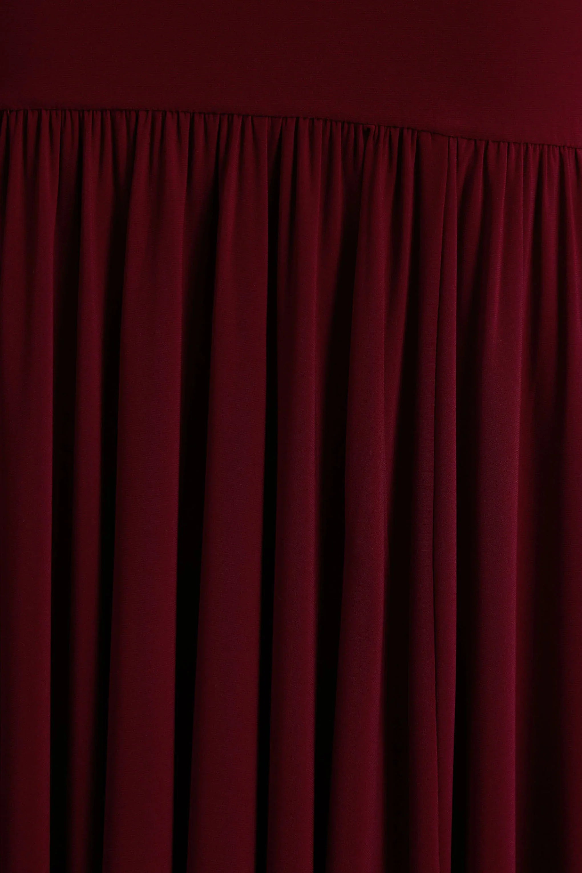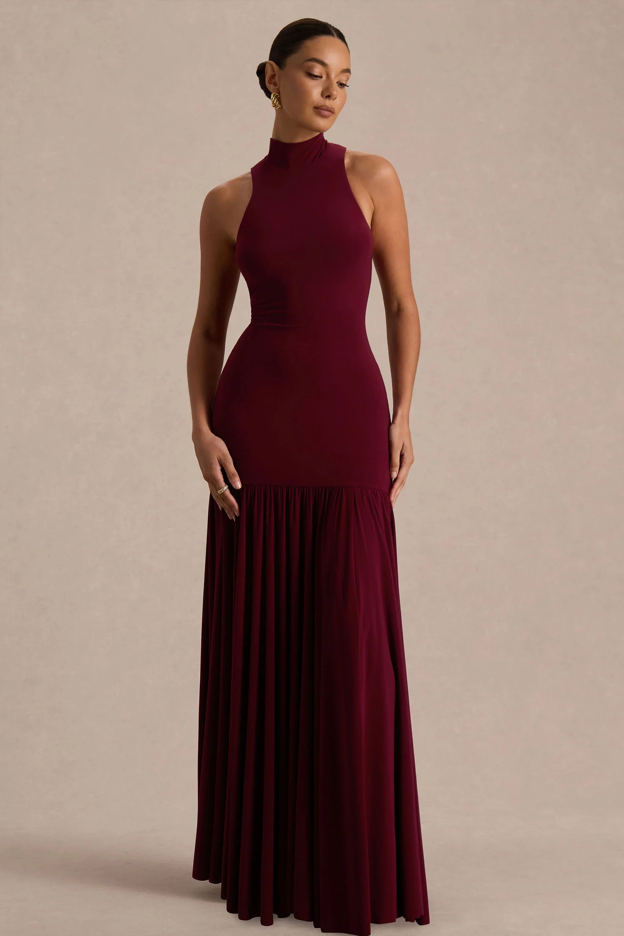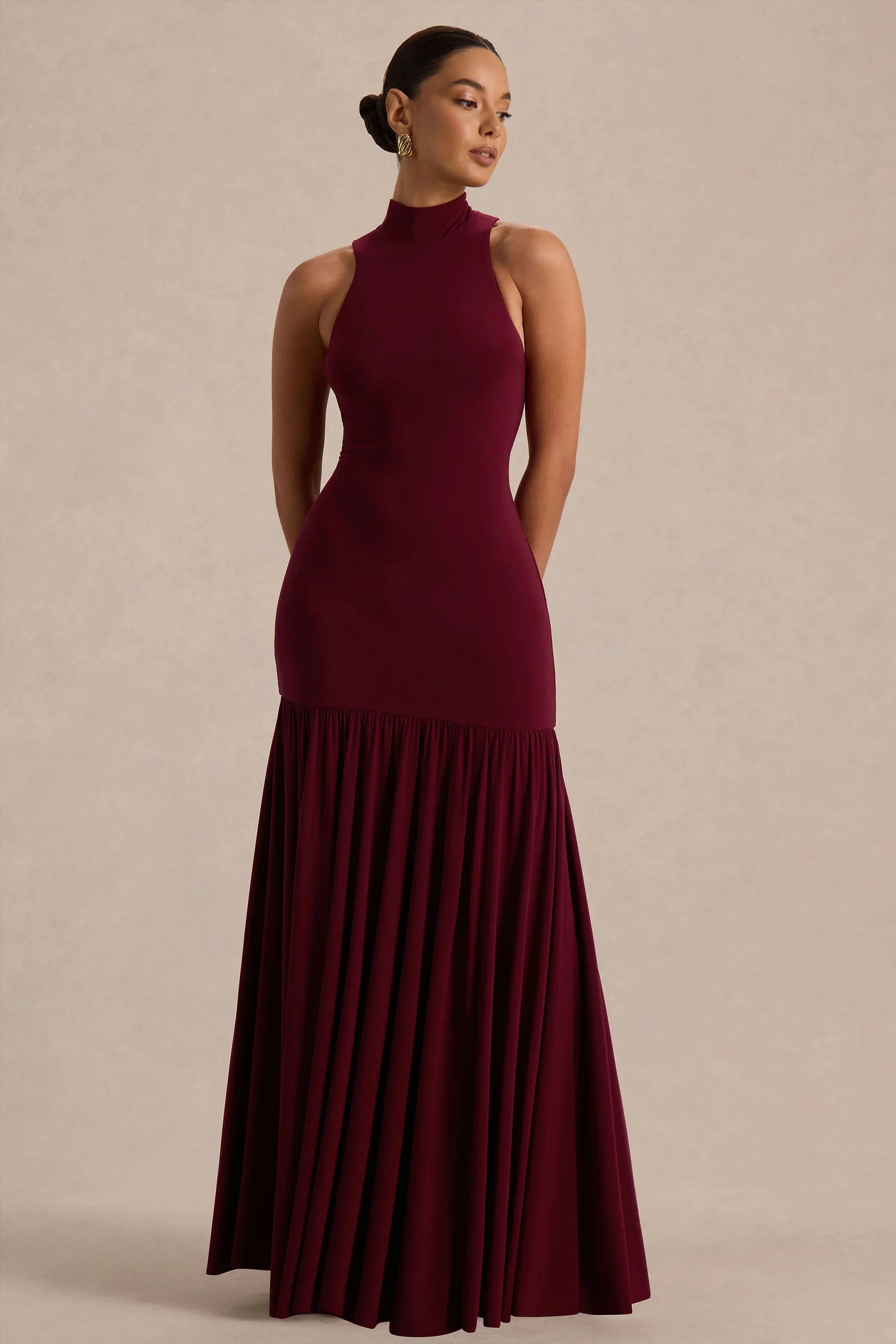 Turn heads effortlessly in Tasmin, a maxi dress that exudes understated elegance. Crafted in a rich burgundy hue of our premium stretch jersey, its sleeveless design and maxi length create a flattering silhouette that drapes beautifully over the body. Featuring a sophisticated high neckline and a chic drop waist, this piece combines classic tailoring with contemporary style. Perfect for evening events or special occasions, Tasmin offers a sleek look with effortless glamour.
