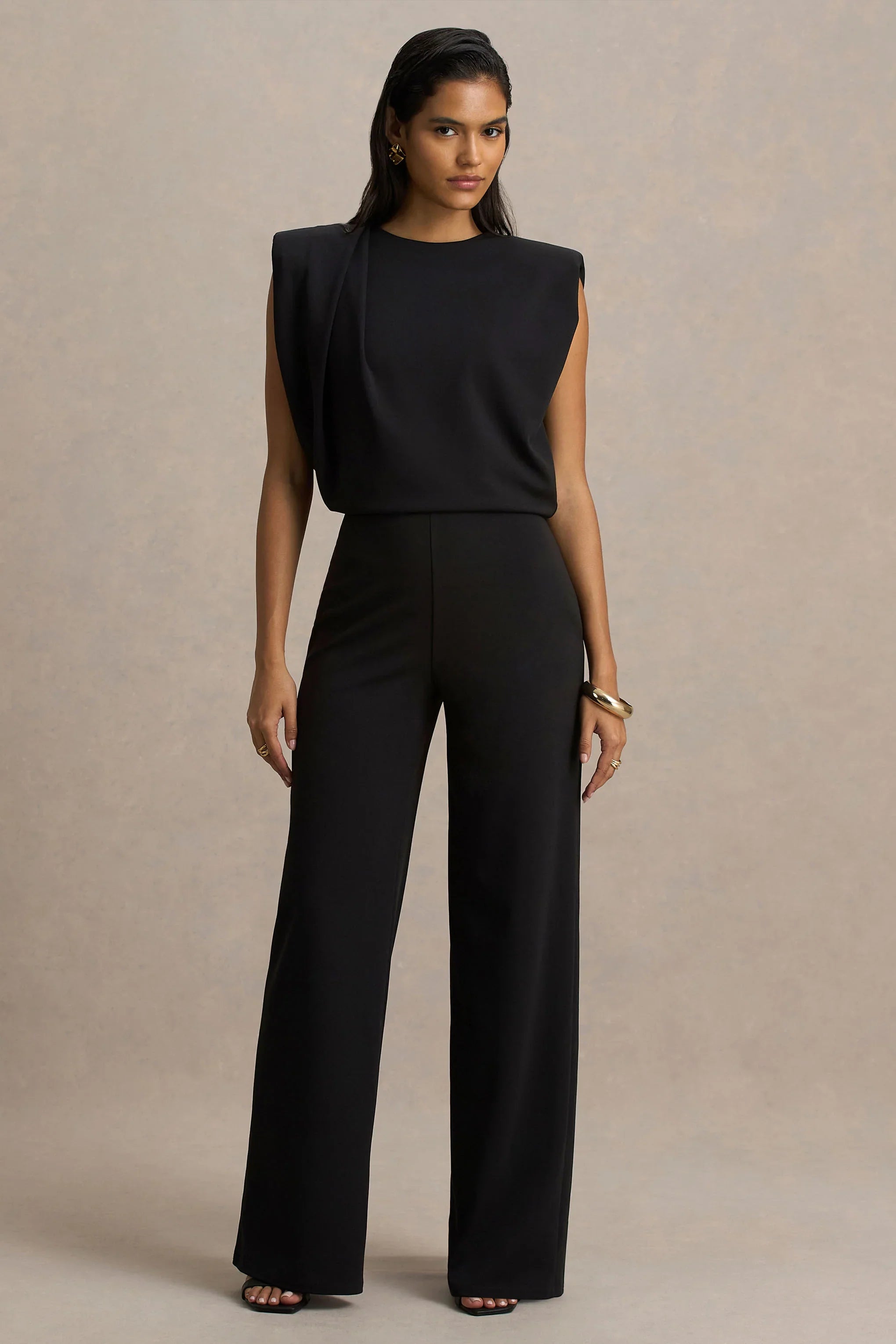 Step into effortless sophistication with our Tiff jumpsuit. Crafted from a classic black shade of our premium scuba crepe, this luxe fabric sculpts the body while offering comfort and a sleek finish. The draped blouson bodice creates a flattering silhouette that balances volume with structure, complemented by a chic crew neckline and sharp shoulder pads for a confident, modern look. With a subtle keyhole back opening adding an unexpected touch of allure, and wide-leg trousers that elongate the legs, Tiff is the ultimate statement piece. Perfect for turning heads at evening events or upscale occasions this season.