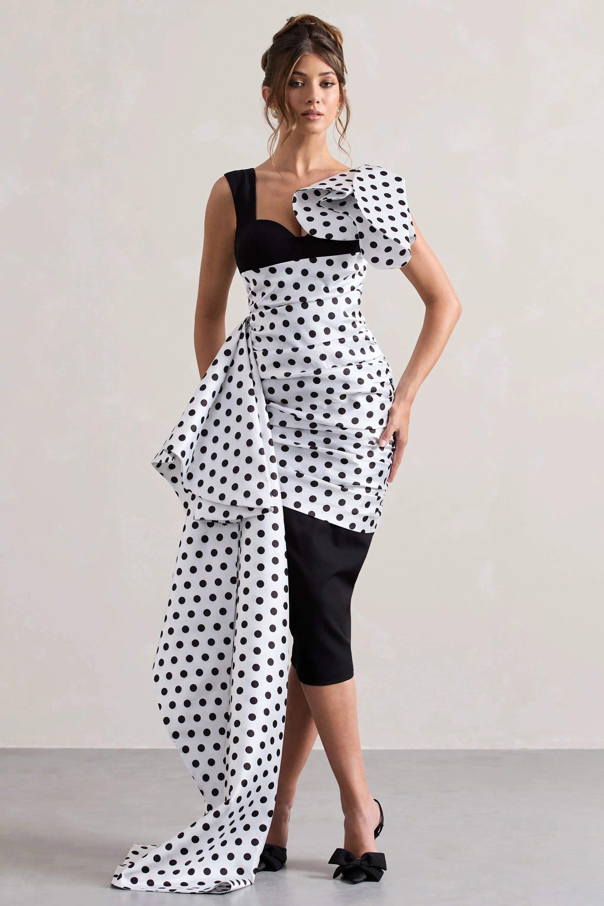 Be the centre of everyone's attention at your next event in Unattainable. This black midi dress has been expertly cut in a premium crepe, boasting a voluminous polka dot wrapped drape. Style this statement midi dress with our Pretty & Poised court heels to complete your look.