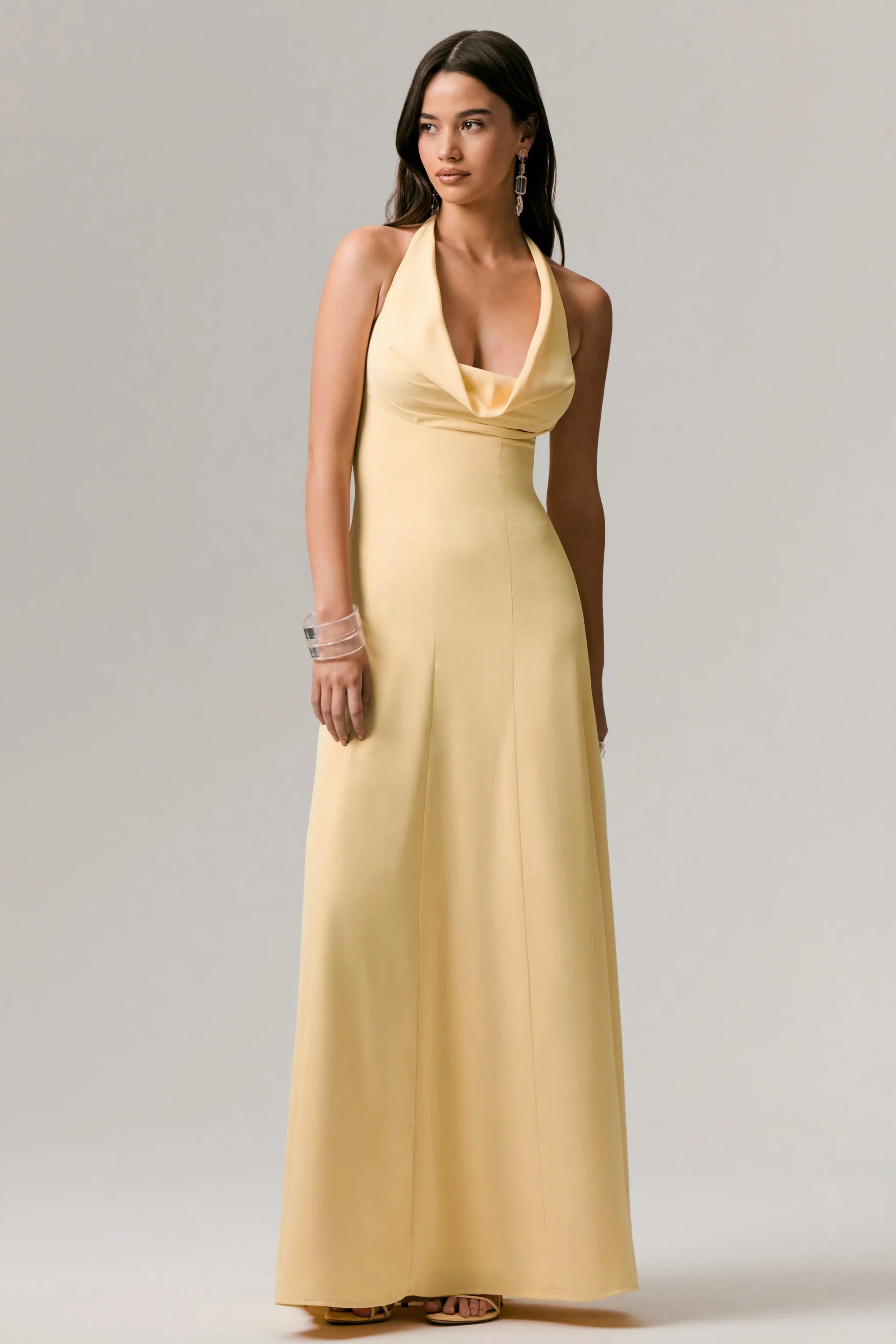 Effortlessly romantic with a hint of drama, Undeniable is designed to make a statement. Cut in a soft lemon shade from our premium lightweight woven, this floor-sweeping maxi is the perfect piece for dressed up moments this season. Featuring a feminine cowl neckline, that elegantly displays the decolletage, and is framed by a functional neck-tie for the perfect fit. Finished with a full skirt that brings effortless movement with every step, Undeniable will be your go-to for moments of understated glamour.