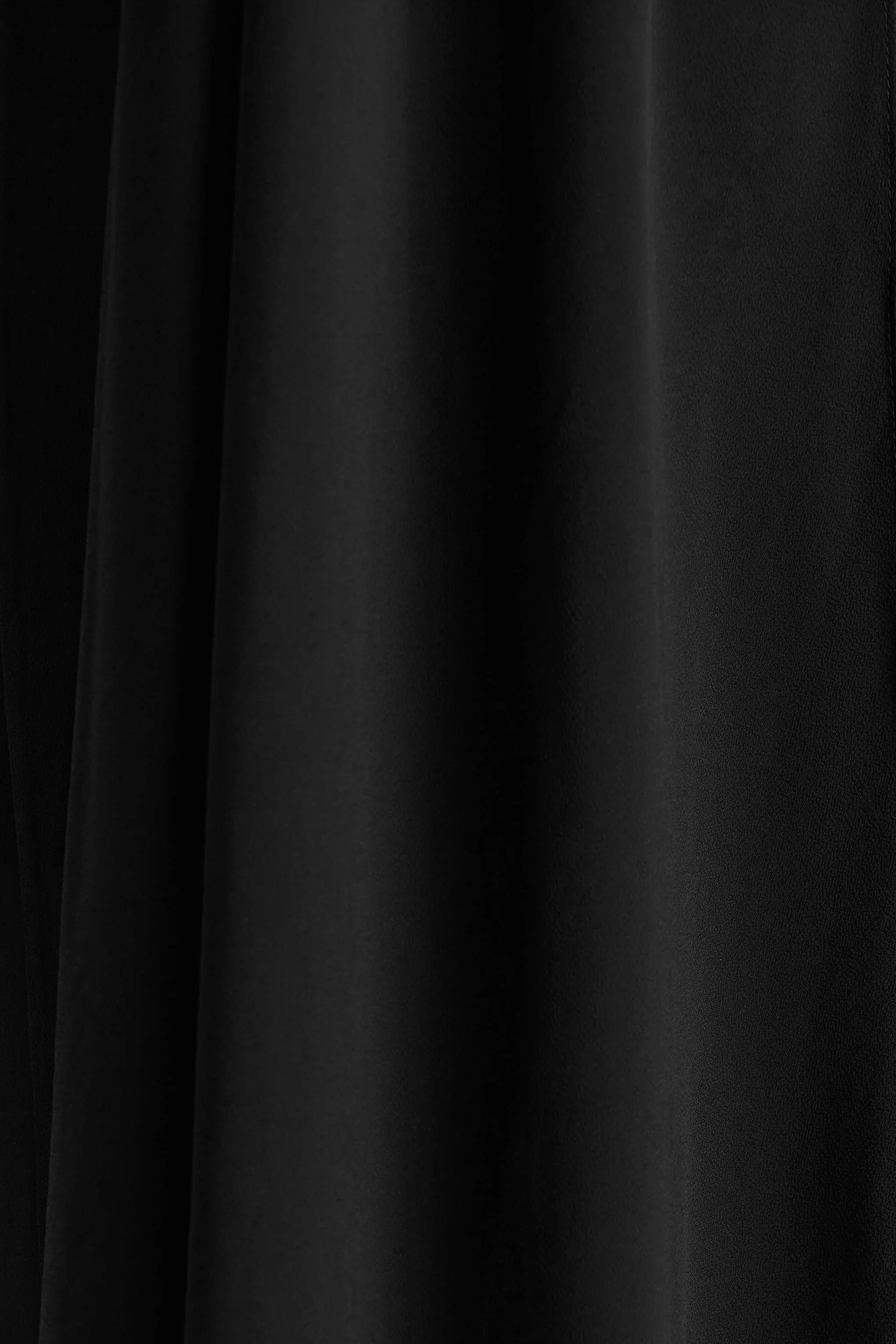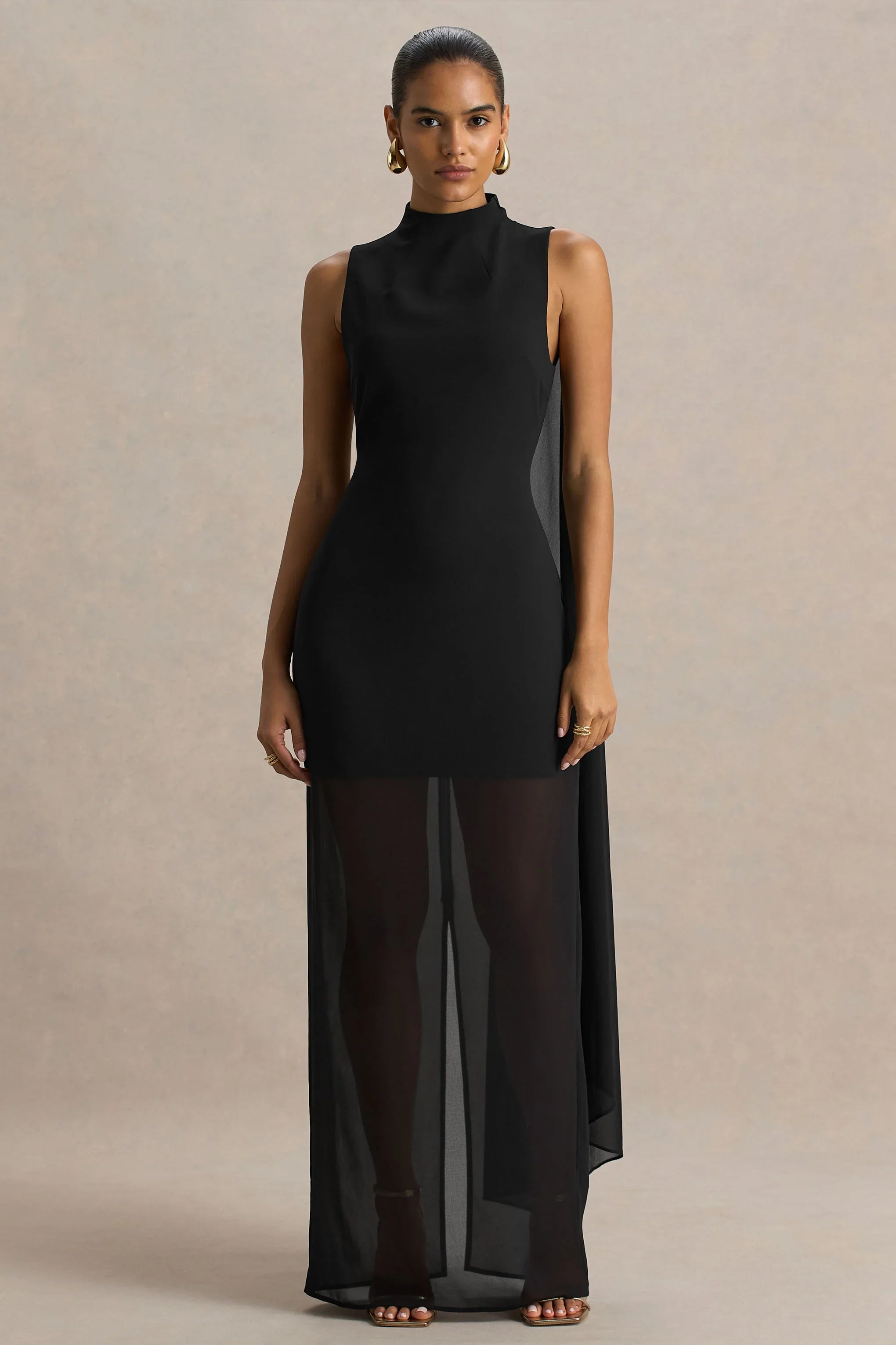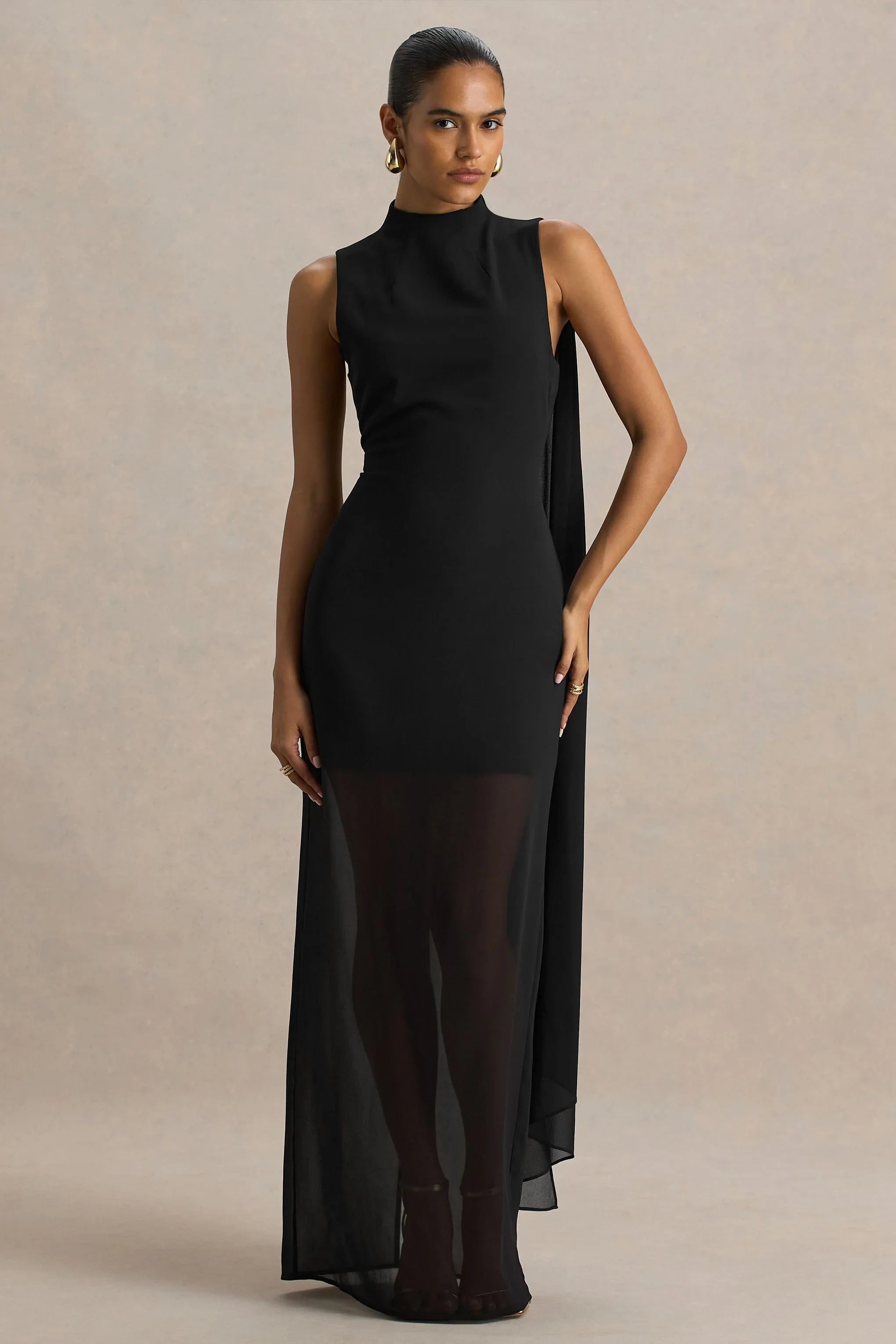 Introducing Unpredictable, a bold and breathtaking piece for your next occasion. This maxi dress stuns in a rich black hue, crafted from our premium double georgette and finished with a striking high neckline. The dramatic back cape detail adds an ethereal elegance, while the sheer skirt offers a sultry contrast to the structured silhouette. This floor-sweeping design is made to captivate with every step, style with sleek heels and gold accessories for an enchanting look.