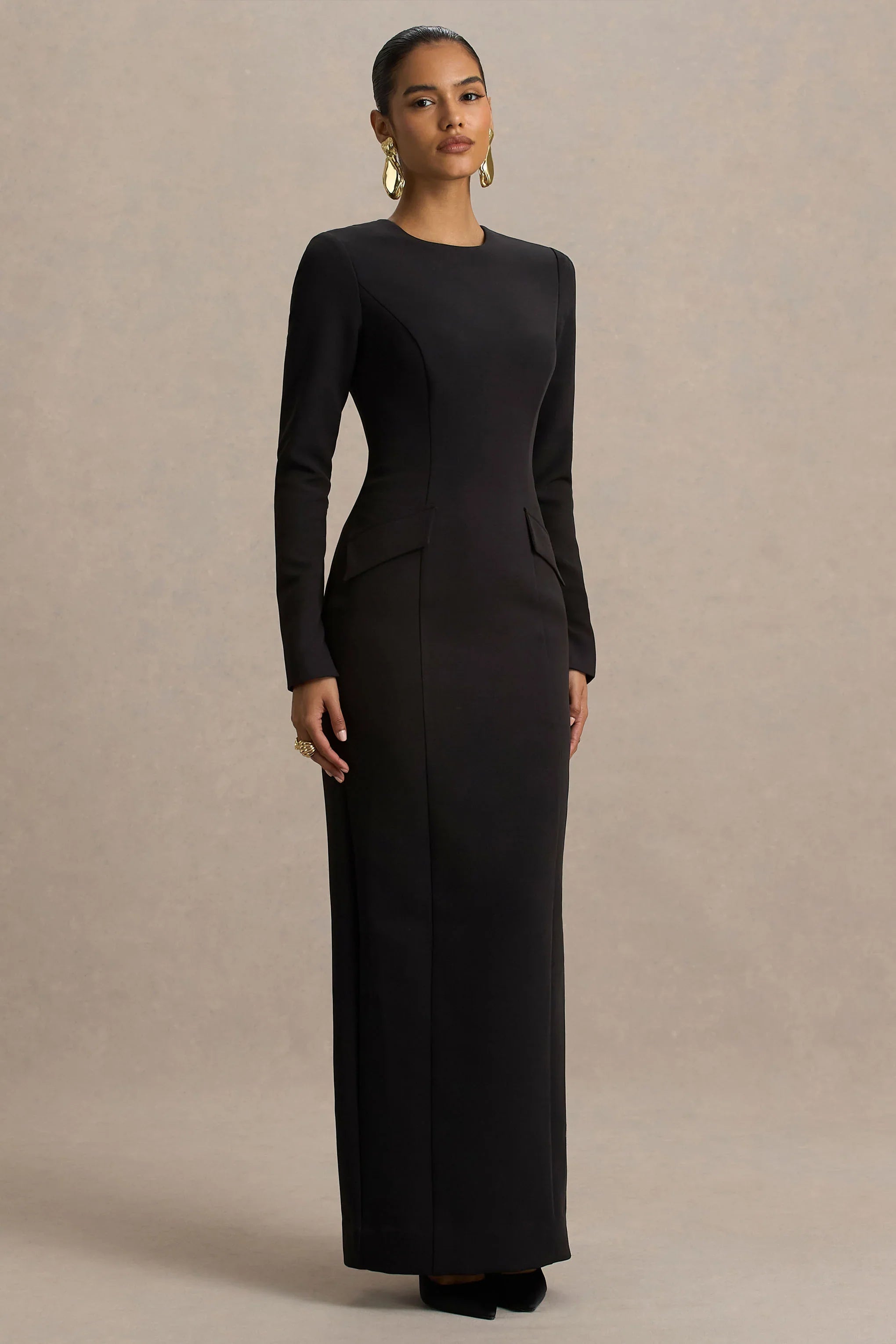Say hello to Valia, the maxi dress that combines sleek sophistication with modern detailing. Crafted from our premium black crepe, its floor-length silhouette flatters the figure with effortless elegance. The high neckline and split sleeve detail add contemporary chic, while mock pockets bring a stylish, structured finish. Finished with a centre-back split for movement, Valia is your go-to for timeless evening dressing.