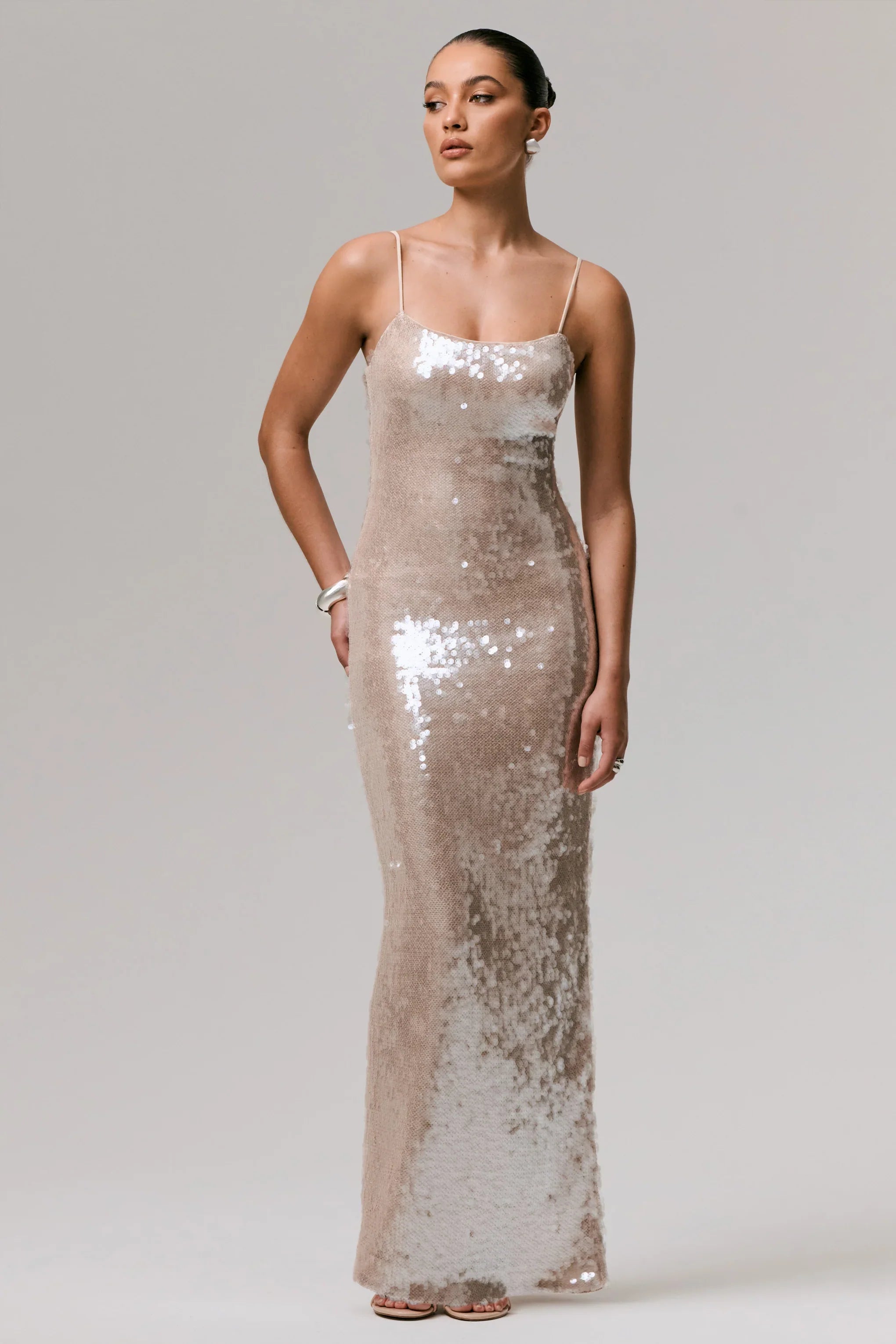 Dripping in decadence, Vermont is your go-to for making an unforgettable entrance. Crafted from our premium net-based sequin in an ethereal nude hue, this maxi dress was designed to captivate. The figure-skimming silhouette is framed by a timeless square neckline and delicate adjustable cami straps, offering a custom fit that flatters from every angle. A sultry centre-back split adds just the right touch of drama, allowing this piece to move with grace and elegance. Whether it's a black-tie affair or a champagne-soaked celebration, Vermont will steal the spotlight.
