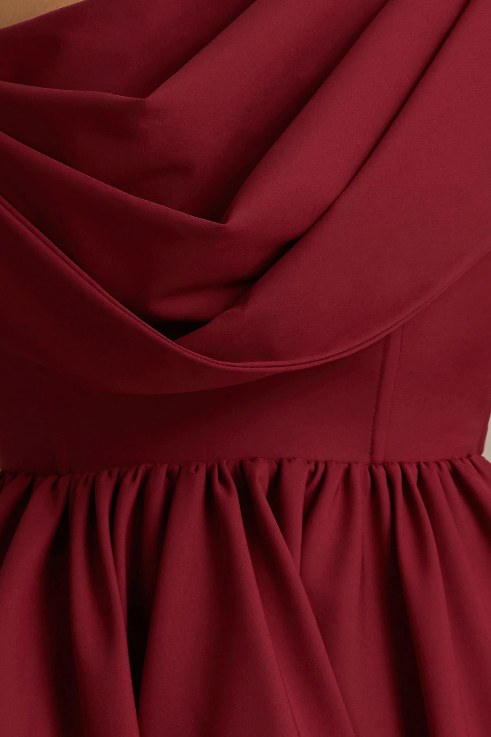 Turn heads with the effortlessly chic Verona. Crafted from our premium burgundy crepe, this mini silhouette flatters every curve, offering a playful yet sophisticated fit. The asymmetric draped neckline adds a touch of timeless elegance, while the skater skirt adds movement and a flirty finish. Perfect for nights where effortless glamour is a must.